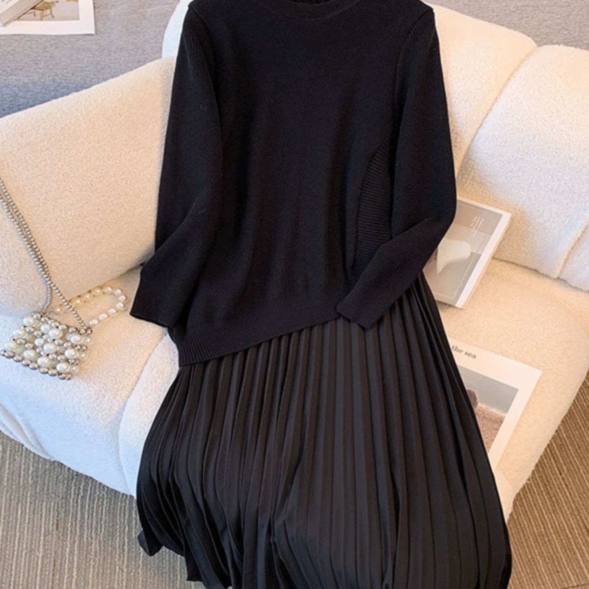 不规则拼接假两件连衣裙女秋冬大码胖mm设计感针织拼接百褶毛衣裙