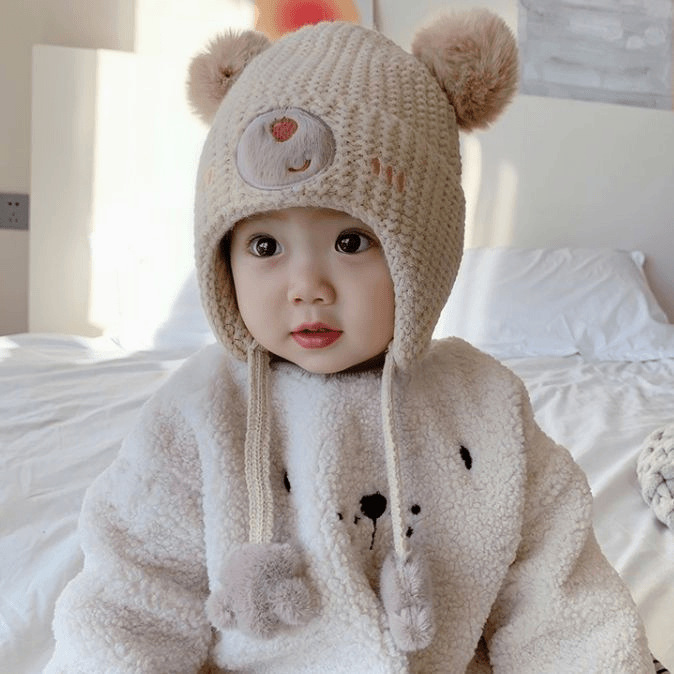 婴儿帽子韩版时尚儿童夹棉护耳冬季男女宝宝保暖防风大帽檐小熊帽