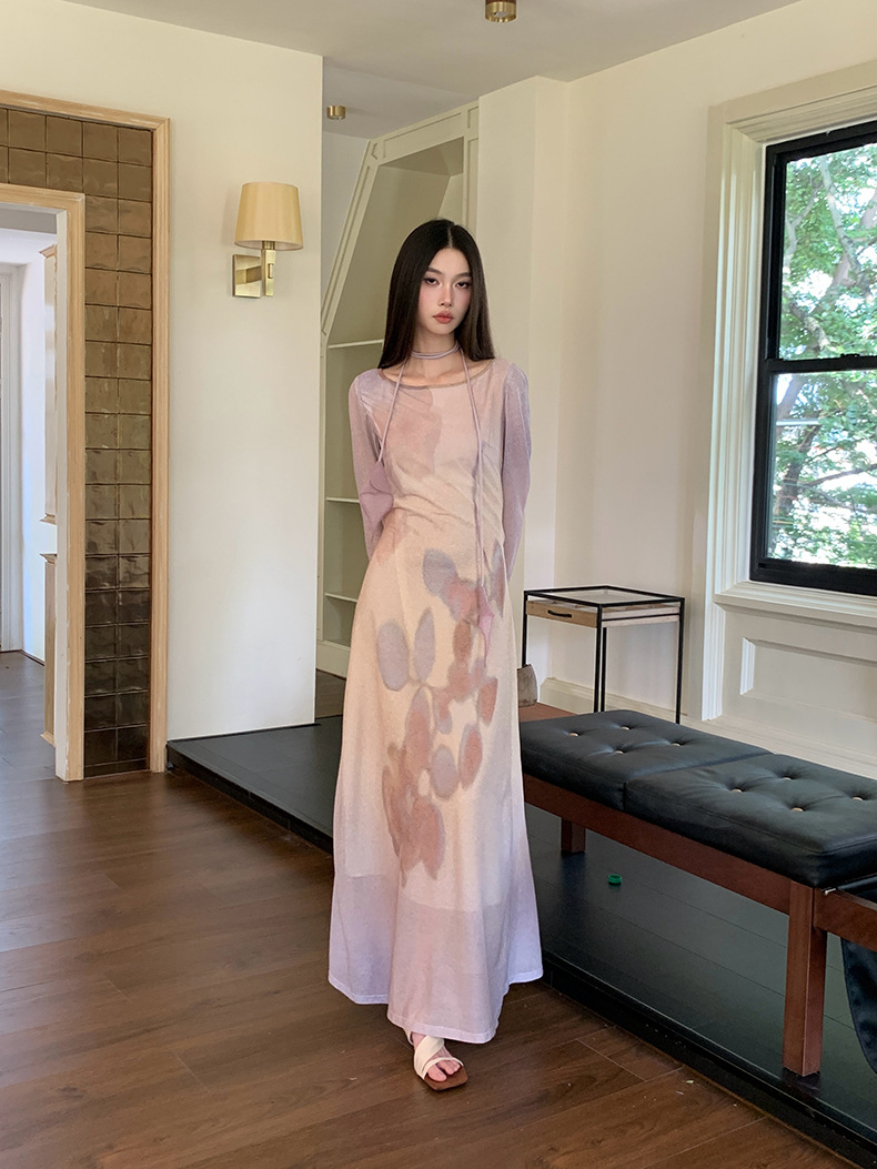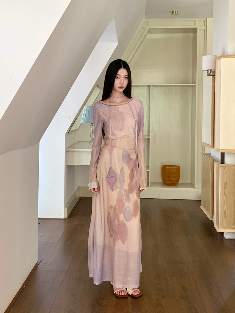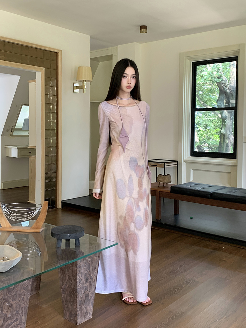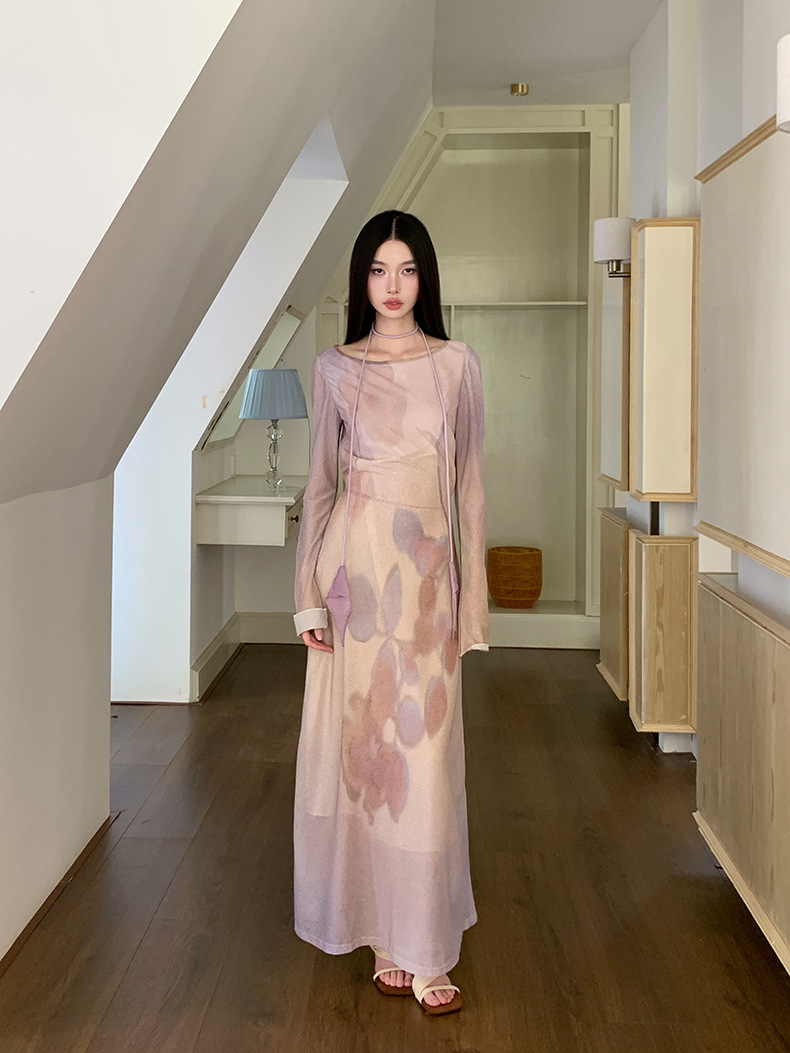 现货网纱印花长袖连衣裙温柔气质修身显瘦长裙