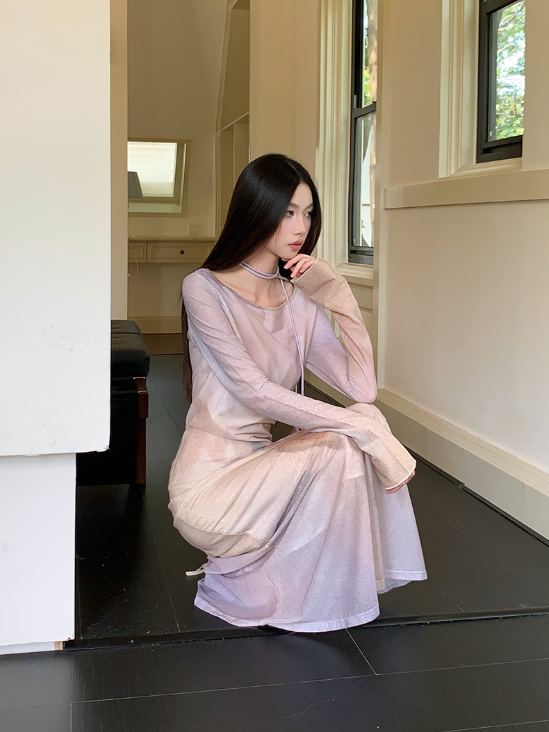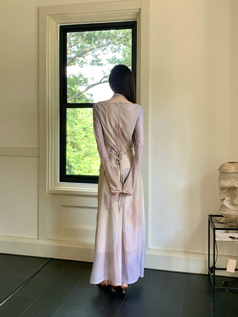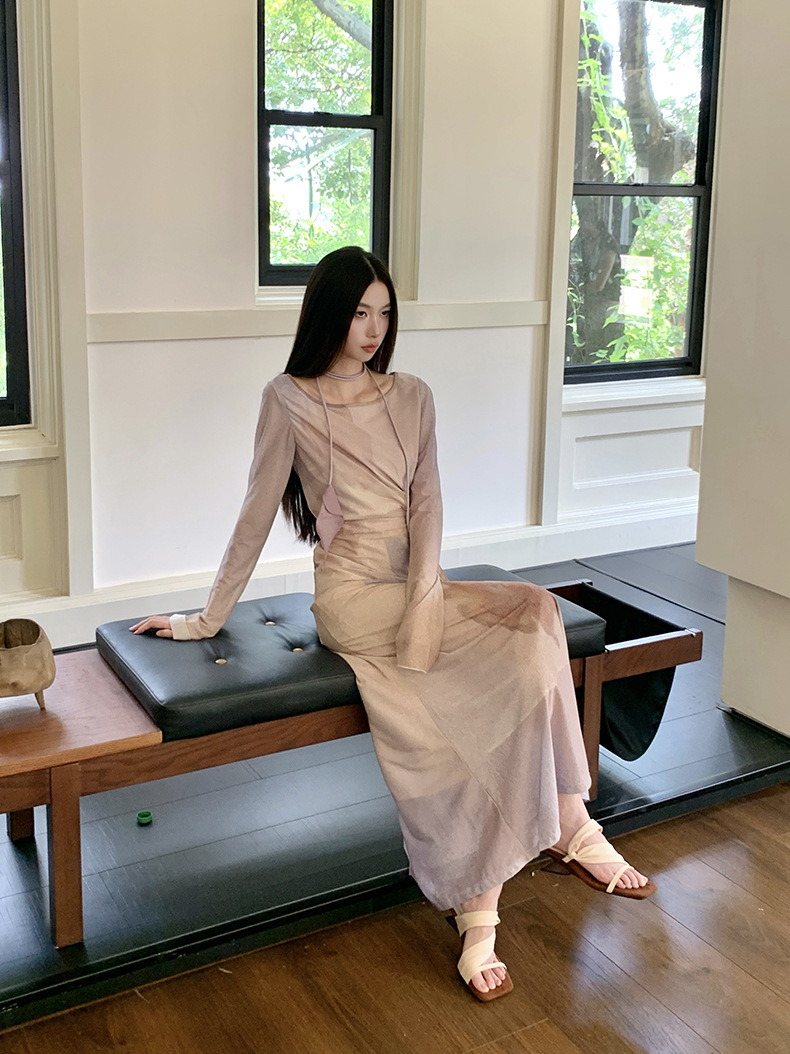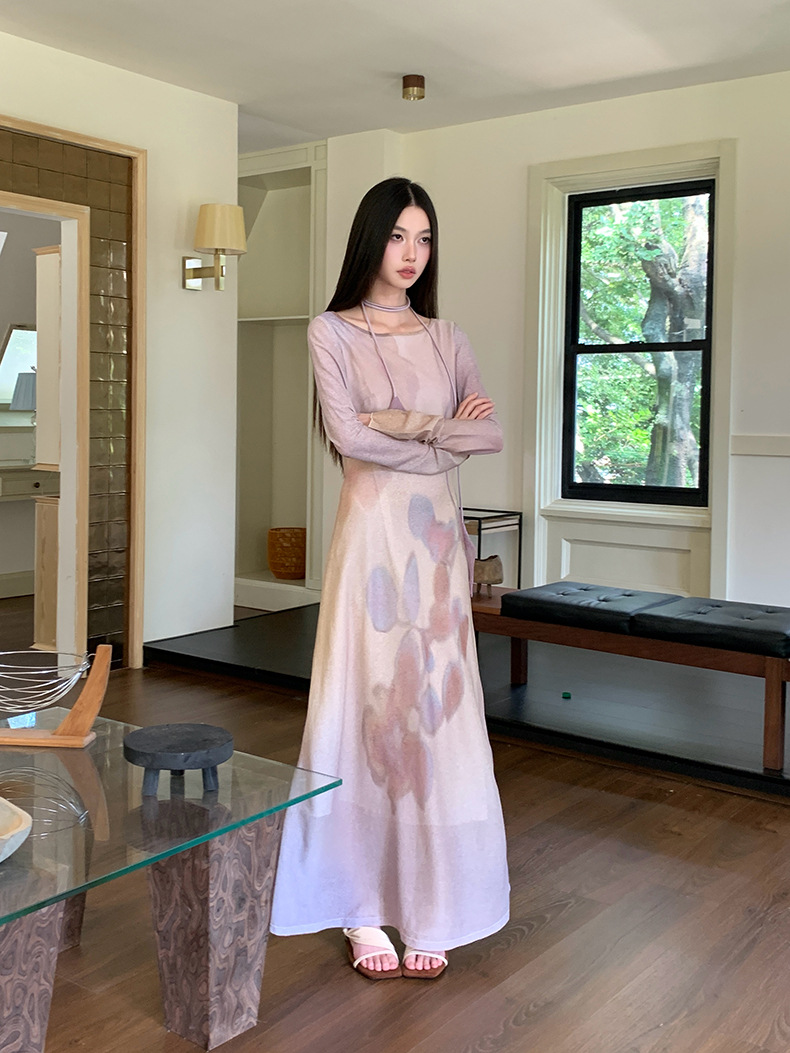 现货网纱印花长袖连衣裙温柔气质修身显瘦长裙
