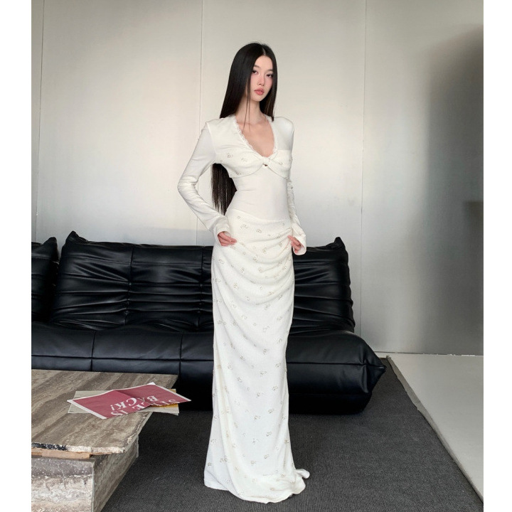 设计感飘带v领连衣裙女秋季新款修身显瘦荷叶边长裙
