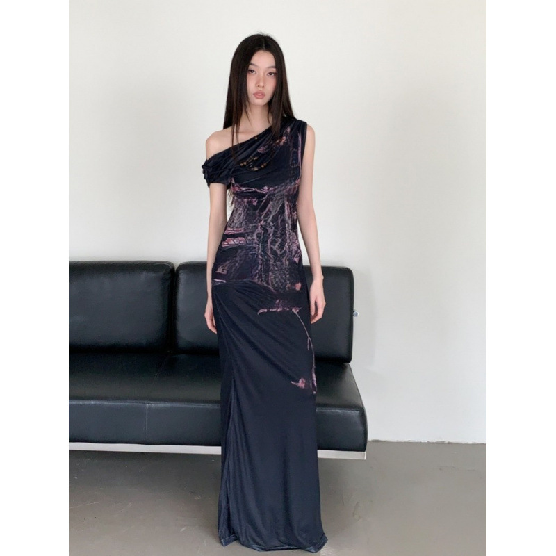 新中国式プリント弾力修身斜め肩魚尾スカート気質ワンピース長スカート