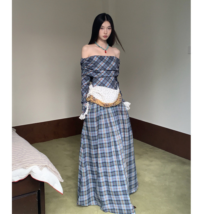 复古小众露肩设计格纹撞色长款连衣裙秋冬新款