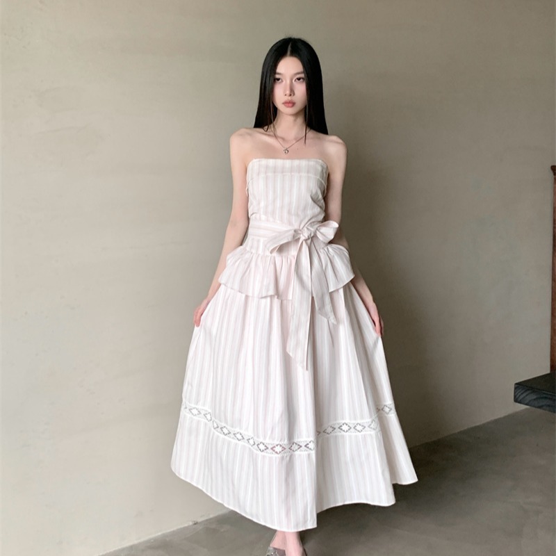 现货粉色条纹吊带抹胸修身显瘦绑带连衣裙长裙女