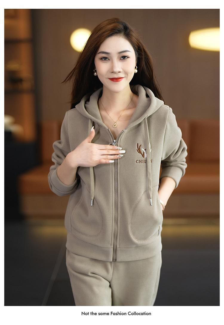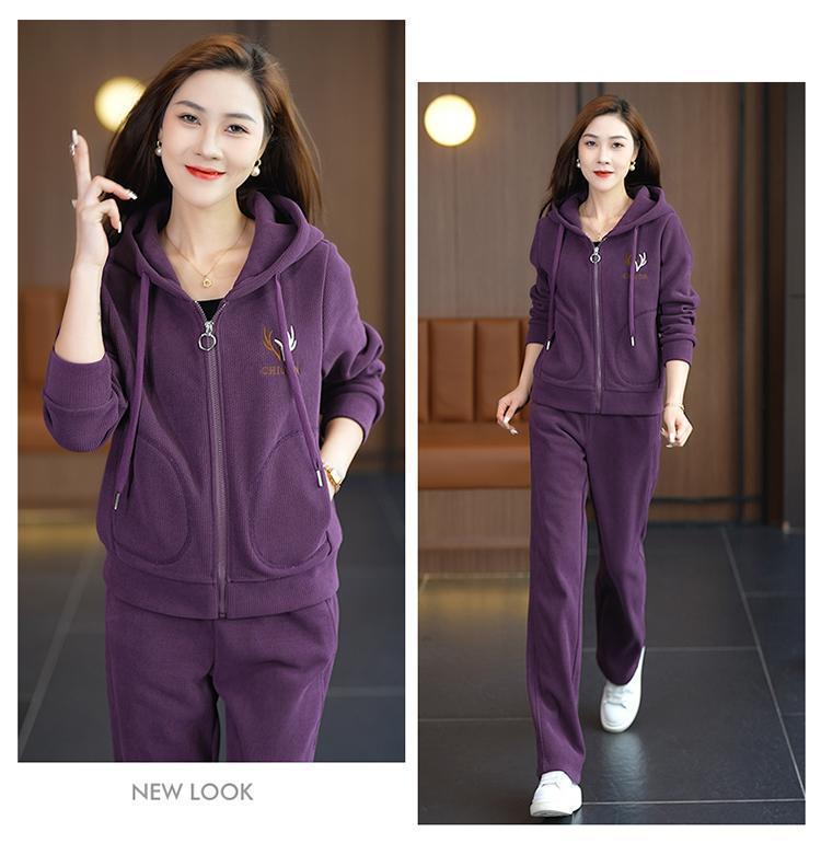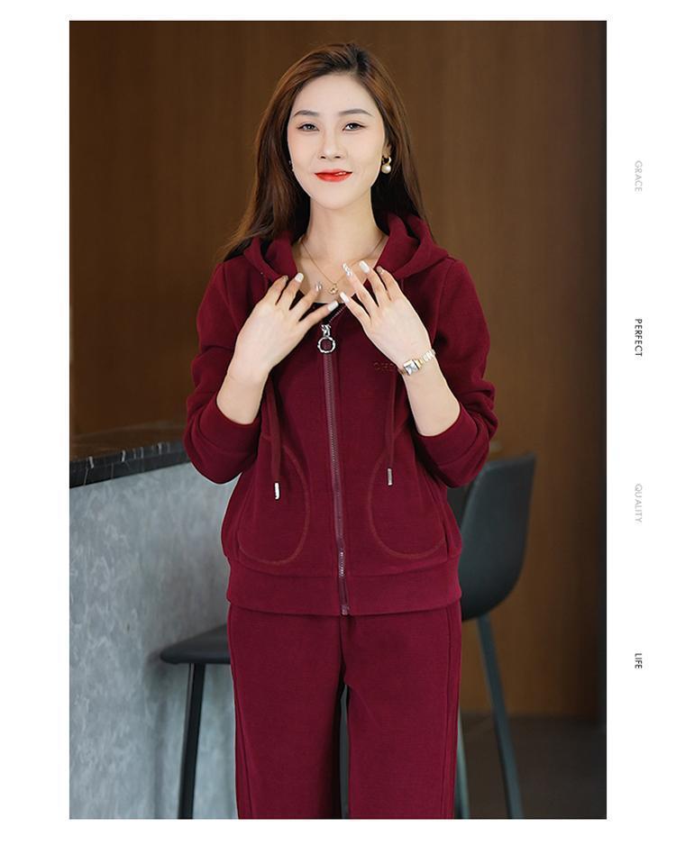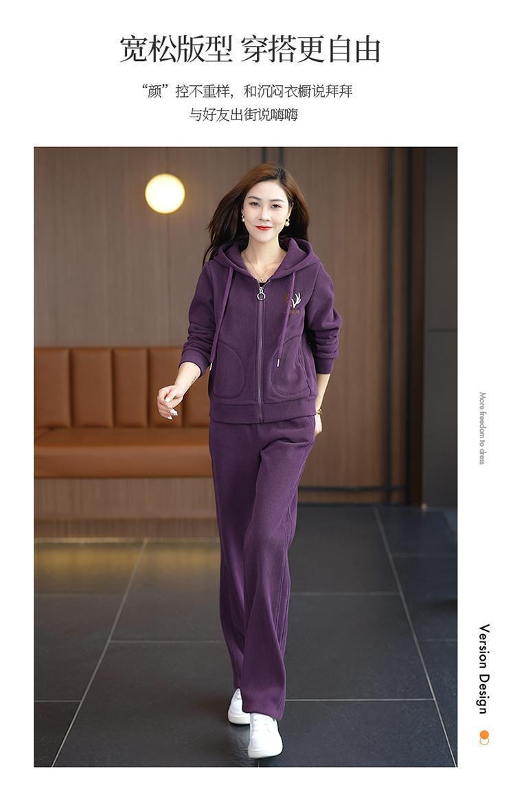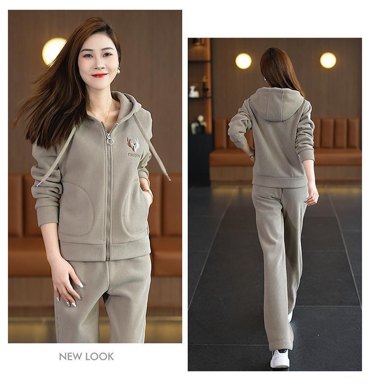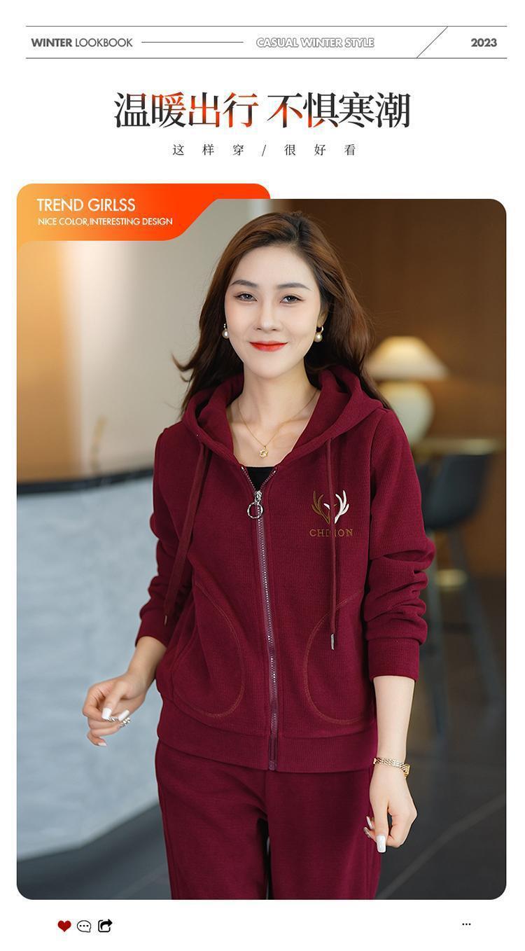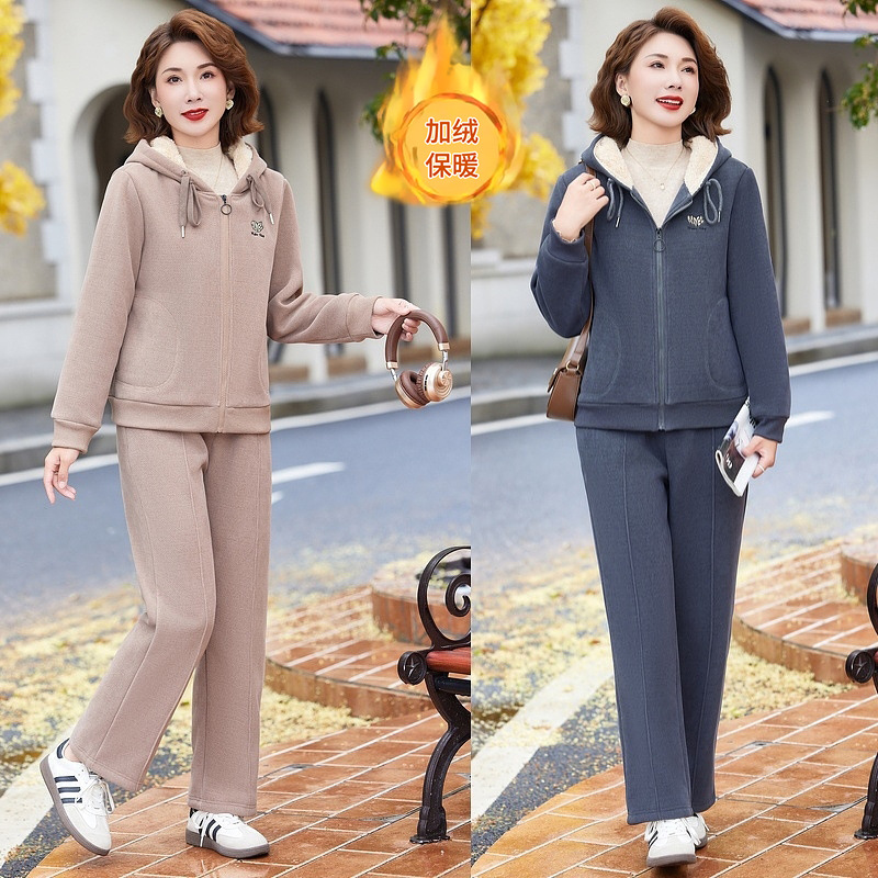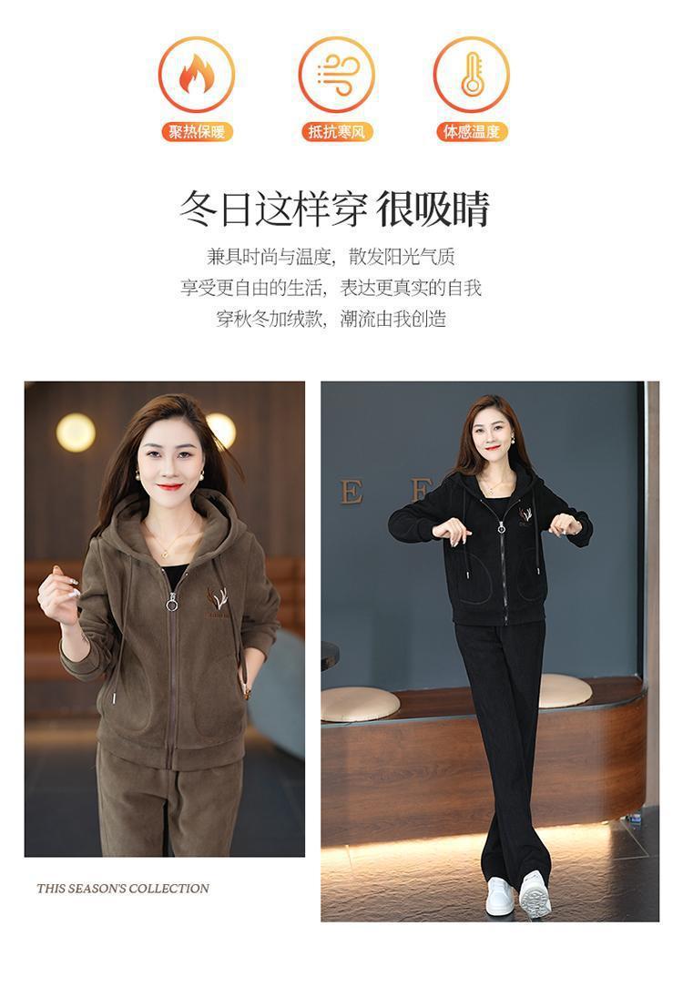 加绒加厚新款冬季休闲洋气宽松连帽卫衣运动服套装妈妈两件套冬天