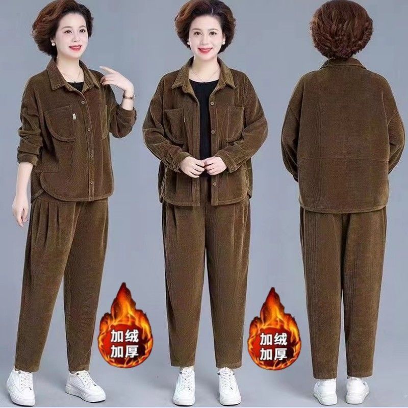 加绒加厚中老年灯芯绒套装女秋冬新款洋气减龄妈妈休闲宽松两件套