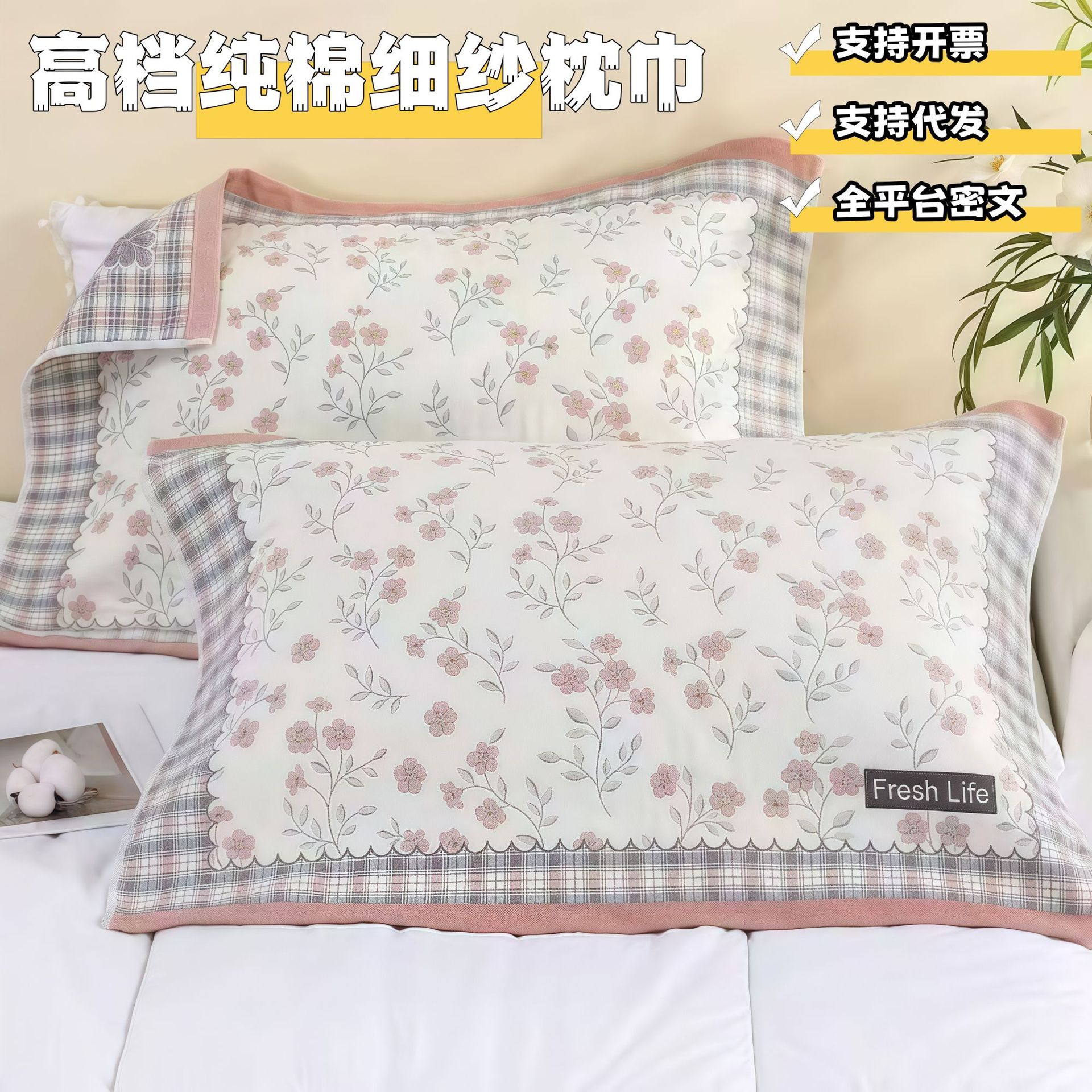 2025新款纯棉纱布枕巾一对装防头油全棉枕头巾吸汗透气防滑不脱落