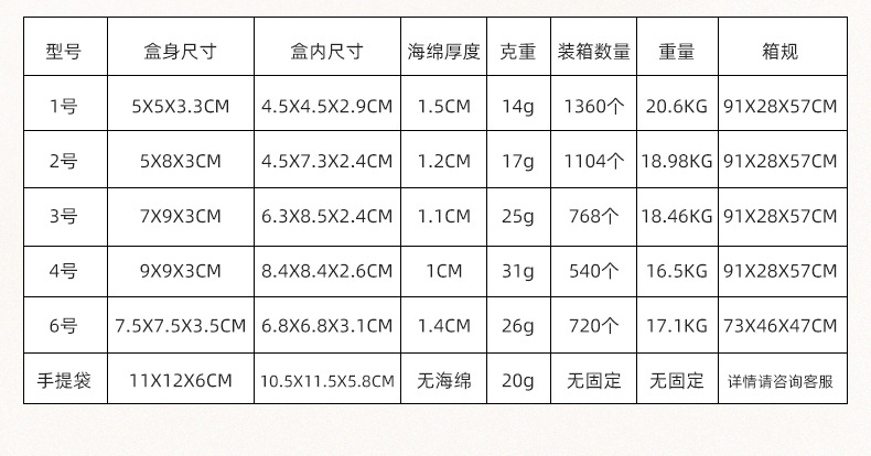 手提袋11*12*6,7*9*3cm[带海绵],9*9*3cm[带海绵],8*11*3cm[带海绵】,5*8*2.5cm[带海绵],7.3*7.3*3.7cm[带海绵],5*5*3.5cm[带海绵]