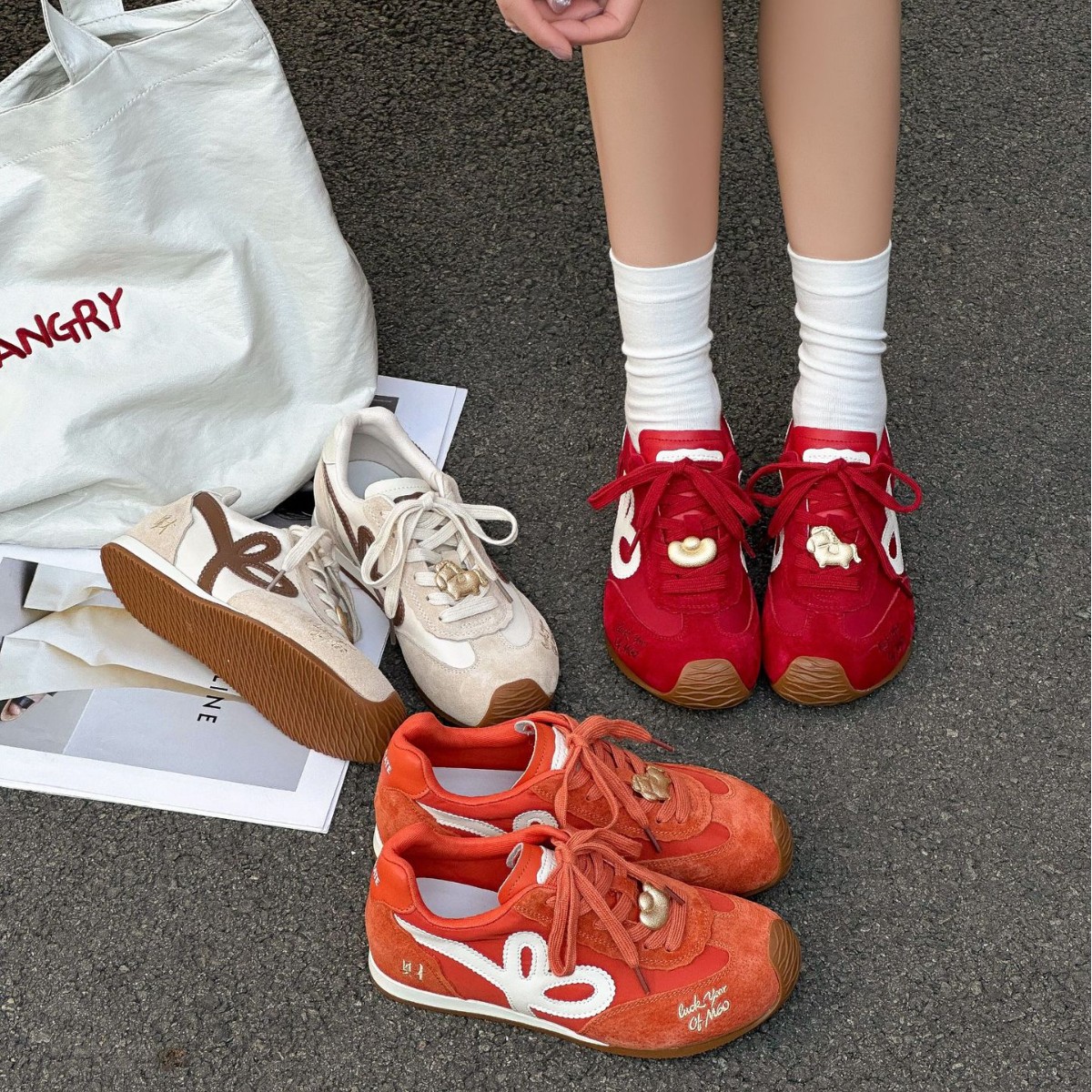 2025年春 パールリボン付き おしゃれで万能なスポーツカジュアルシューズ レトロ風ドイツ訓練靴 フラットシューズ レディース