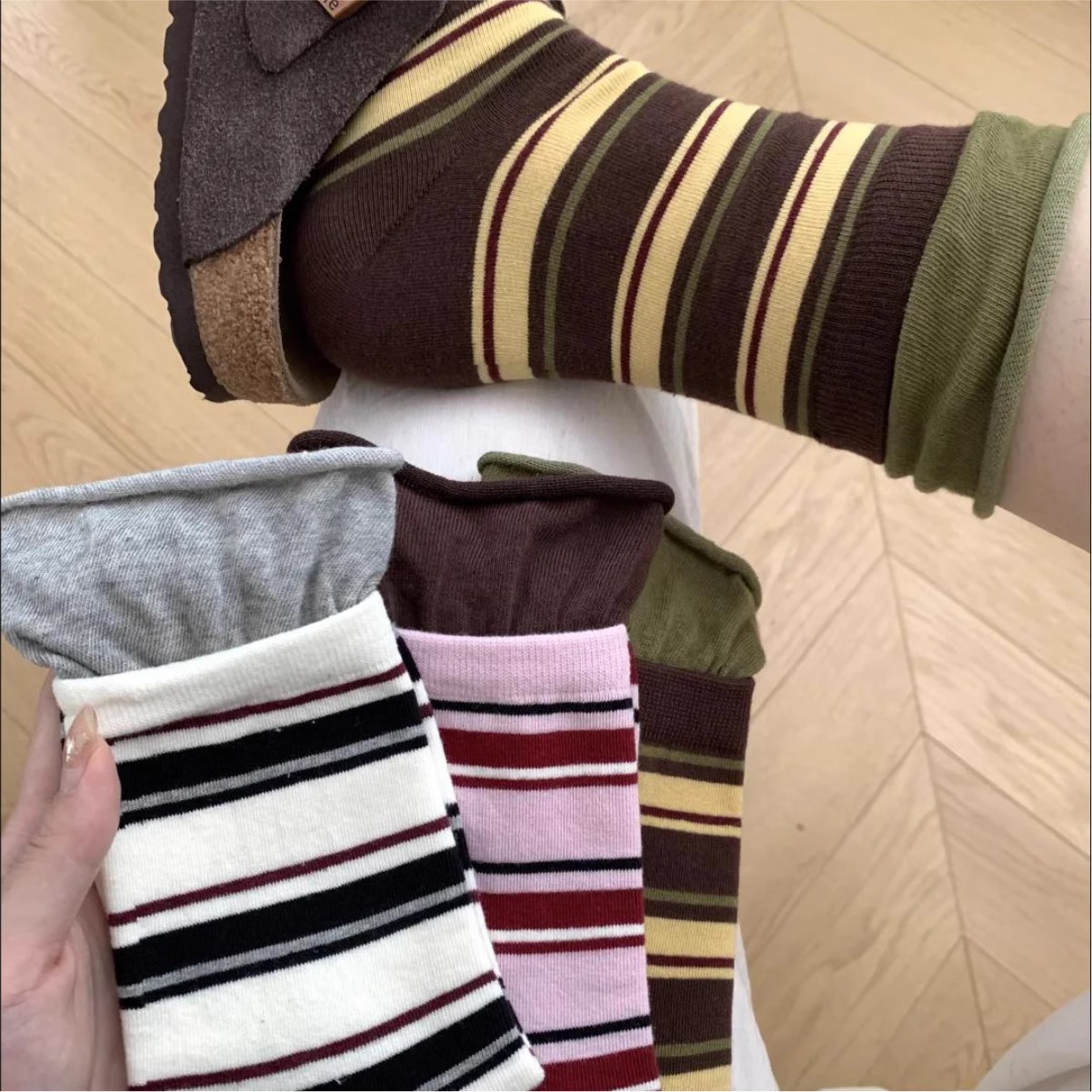 拼接条纹纯棉袜子女中筒袜春夏季ins潮日系个性撞色小众堆堆长袜