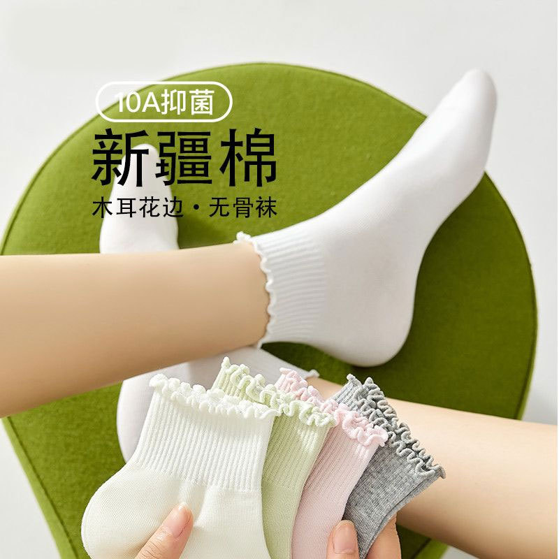 纯棉木耳边袜子女春秋新疆棉袜吸汗防臭中筒无骨白色花边短袜夏季
