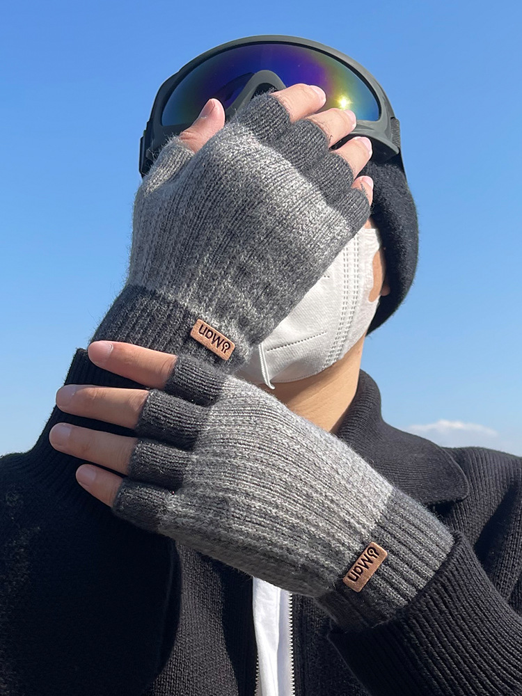 秋冬の厚い半分の指の手袋の男性の防寒の保温の学生のニットの毛糸の露指の騎乗のベルベットは字を書きます。
