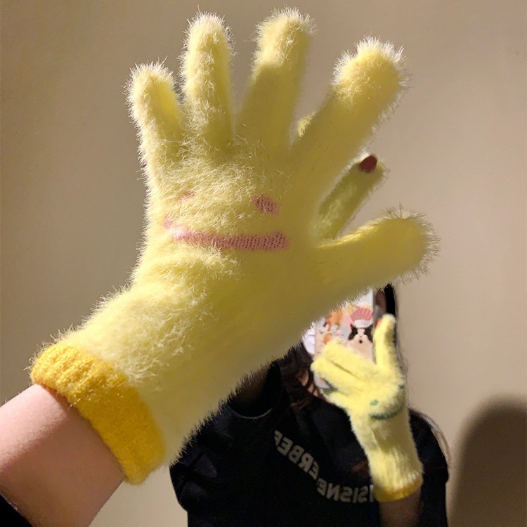 可爱笑脸毛绒露指可触屏手套女冬季加绒加厚学生骑行保暖防寒防风