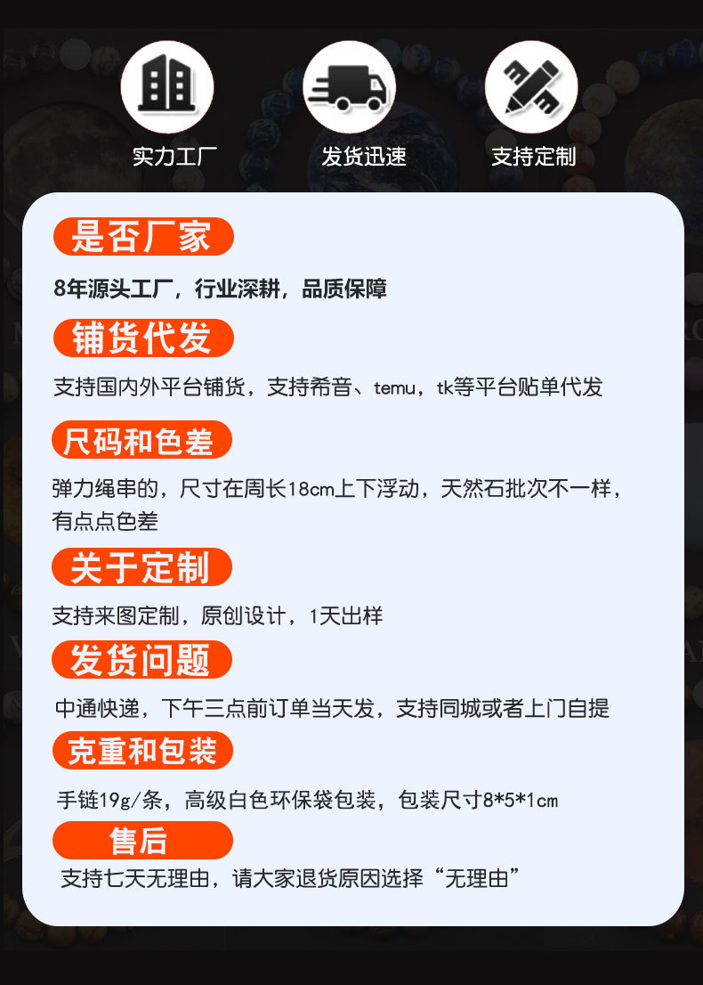 十二星座ブレスレット天然石ビーズ宇宙太陽系八惑星石絵石黒色卸売