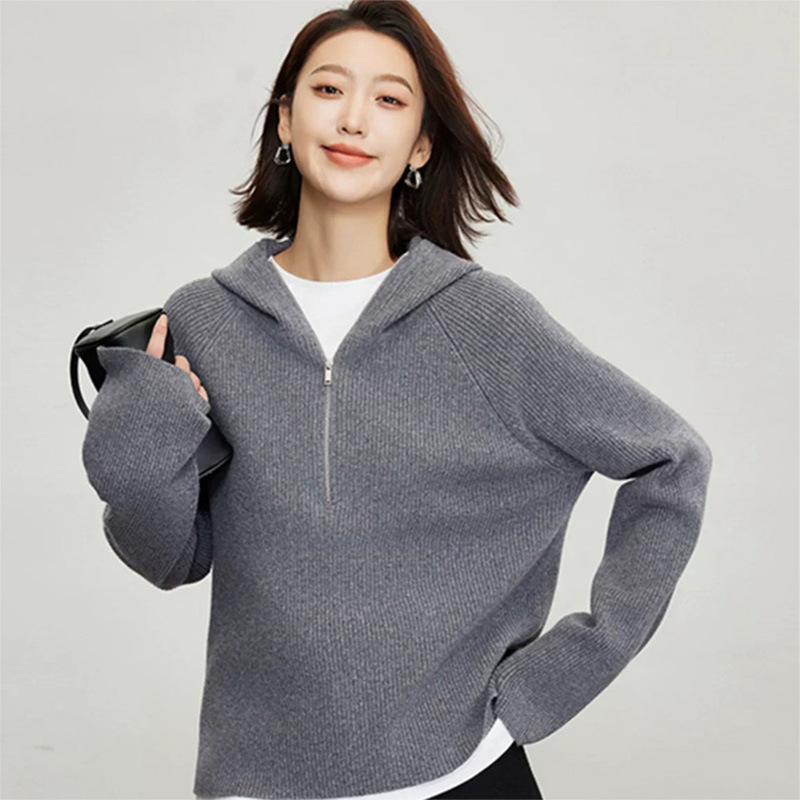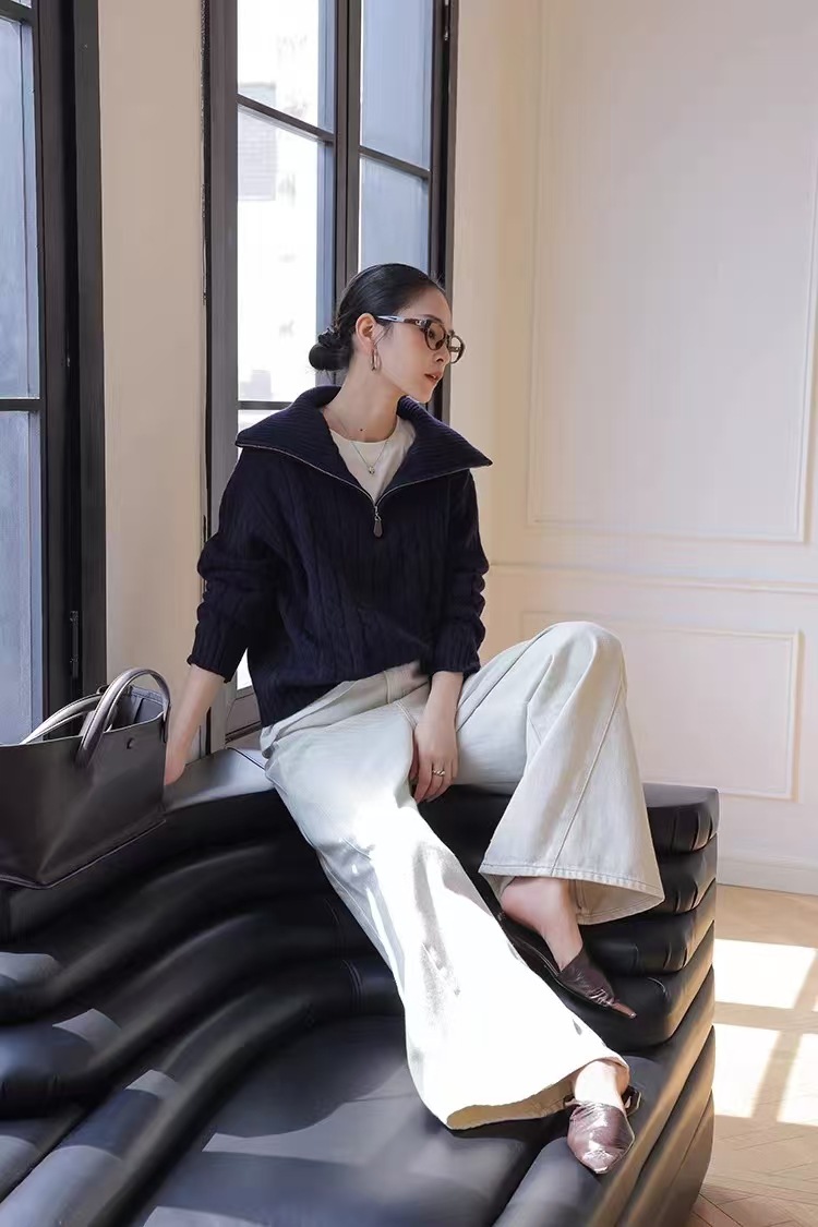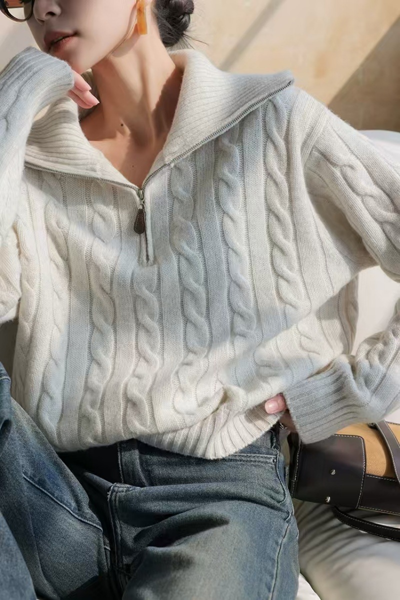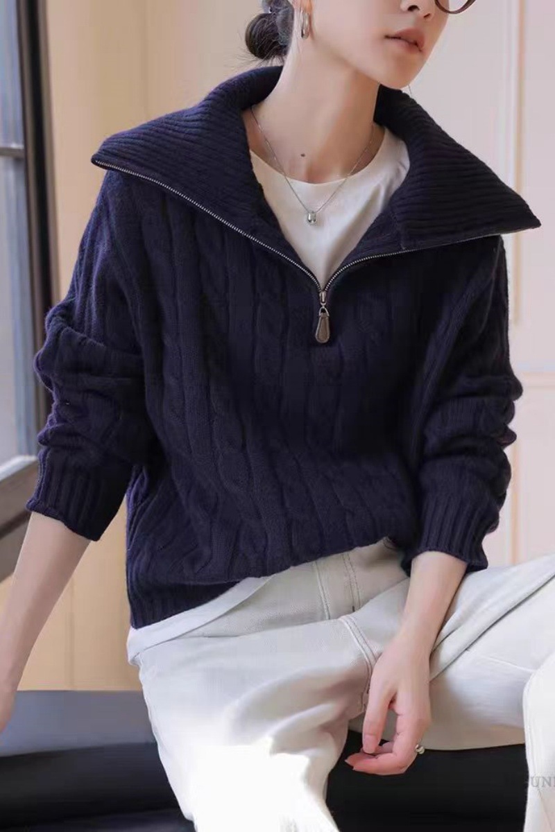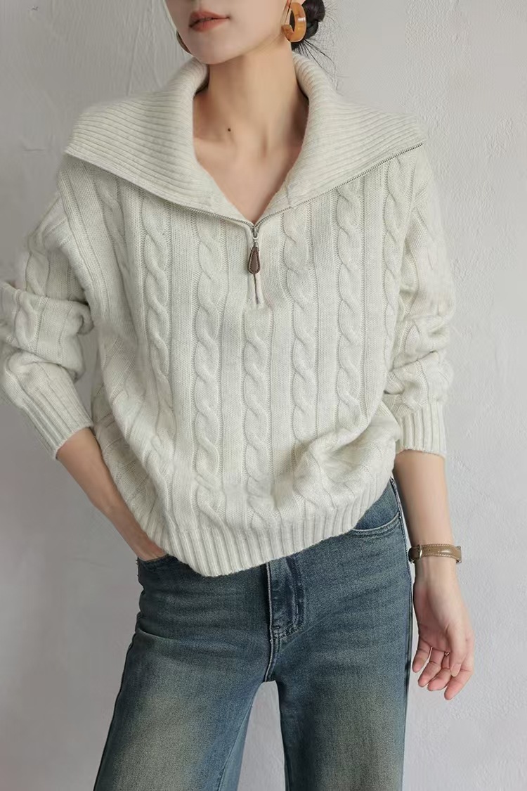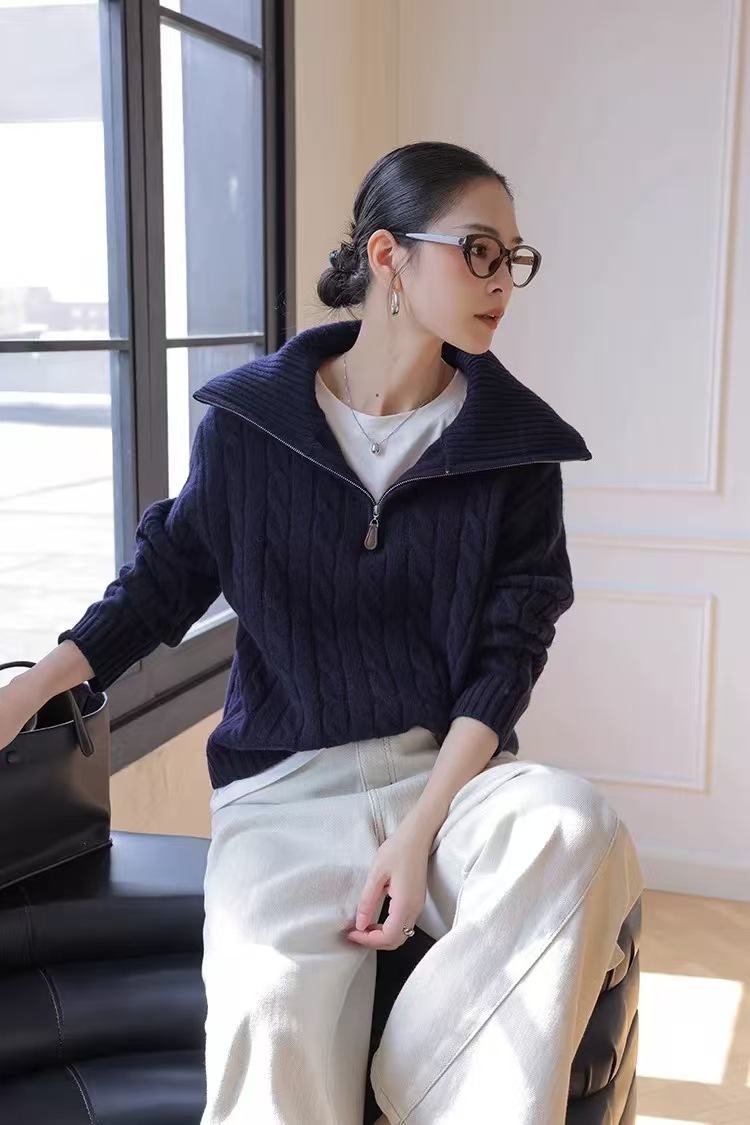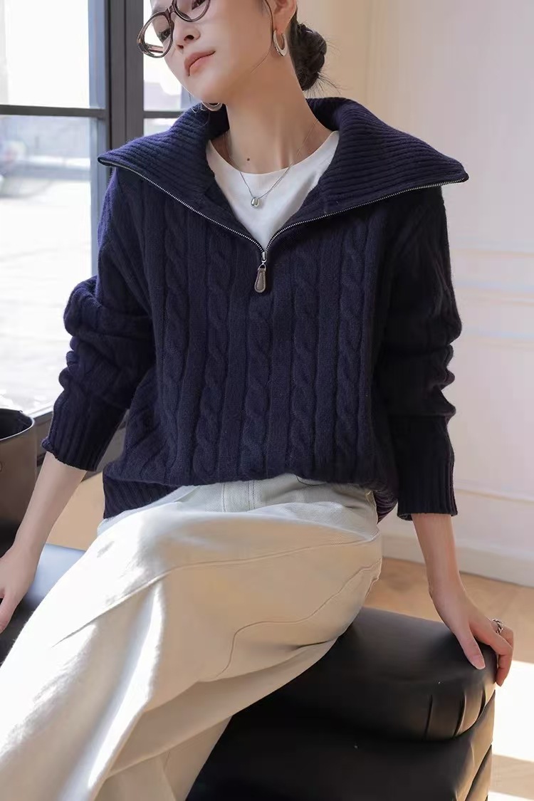 25秋冬レトロなゆったりとしたウールセーター、女性用ハーフジップラペルセーター、新作厚手ニッチニットトップス、ゆったりスタイル
