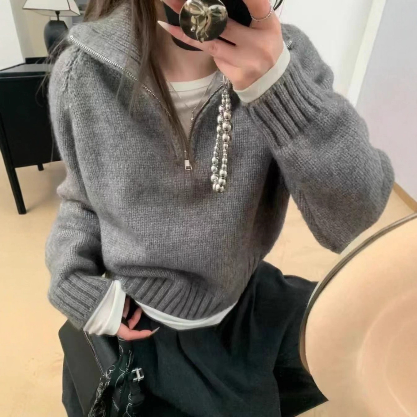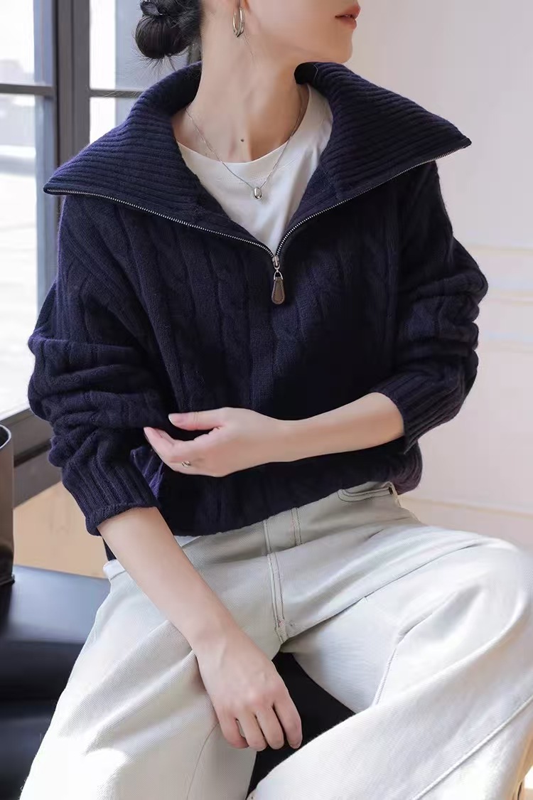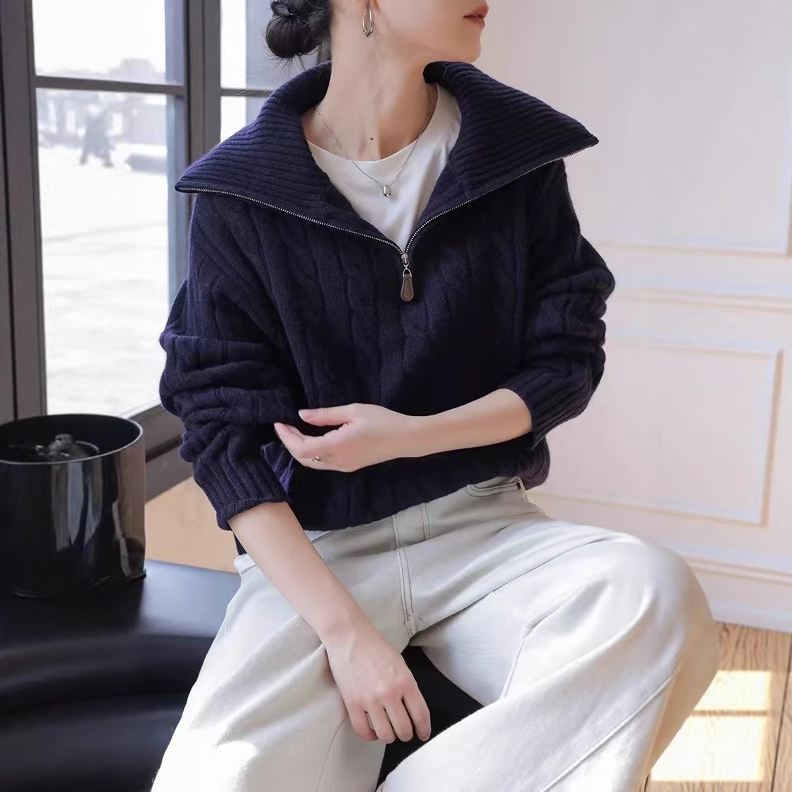 25小众设计感半拉链翻领毛衣女上衣显瘦慵懒风宽松高领针织羊毛衫