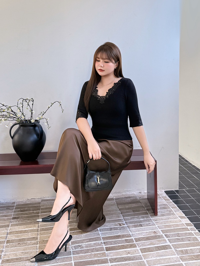 玫瑰刺绣蕾丝V领中袖针织上衣润其9330-1大码法式辣妹轻奢镂空衣