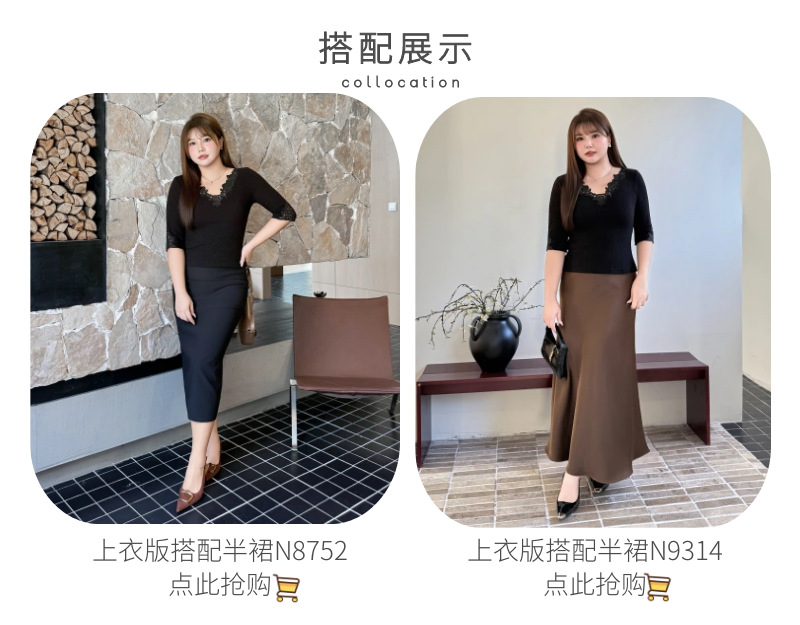 刺绣蕾丝V领中袖针织上衣连衣裙润其9330大码克制浪漫虚实对比