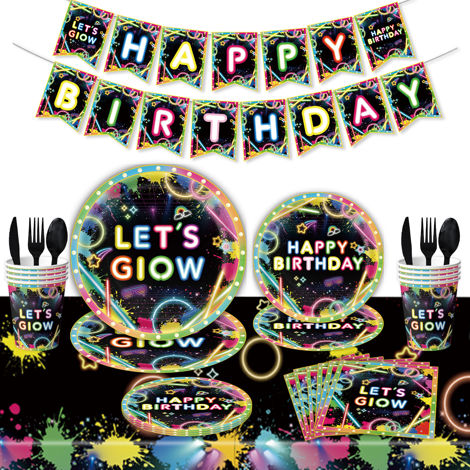 亚马逊创意彩色霓虹灯主题迪斯科生日派对装饰餐具用品拉旗五件套