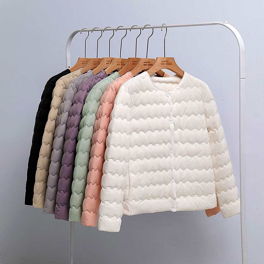 秋冬の新型丸襟の薄いダウンジャケットの女性の短いタイプの波の紋様は襟がなくて保温します。