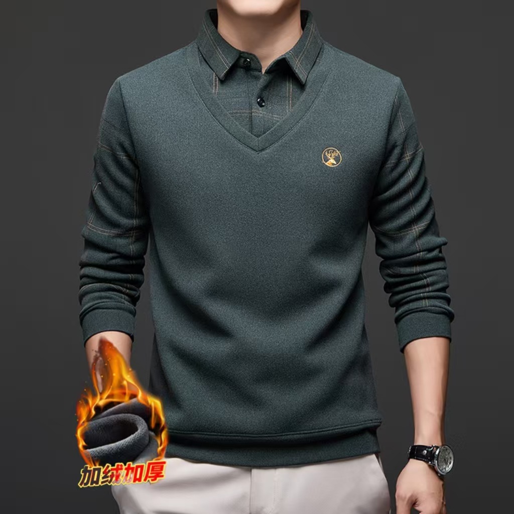 含羊毛桑蚕丝男士假两件秋冬格子新款加绒加厚长袖Polo衫男t恤