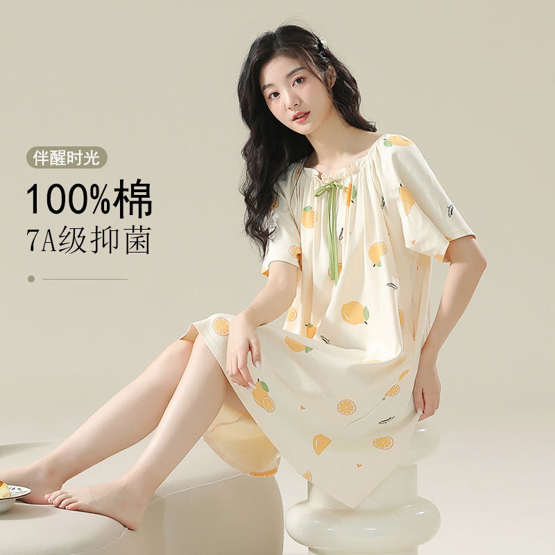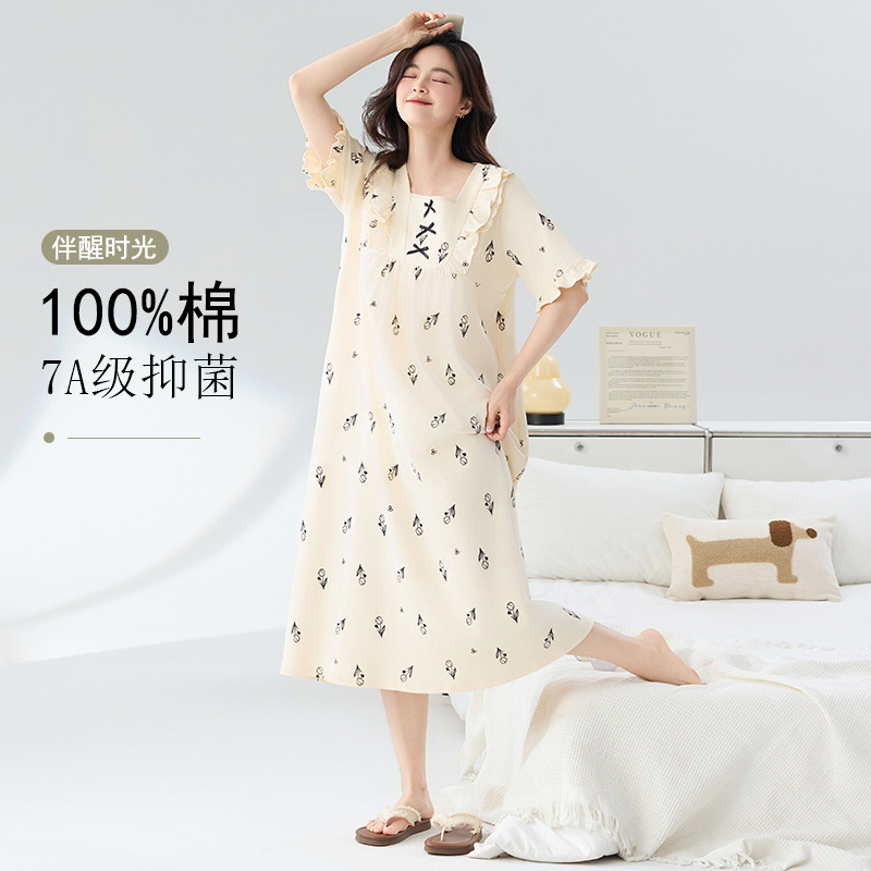 クラスA抗菌綿レディースナイトガウンレディース夏半袖ドレスレディースミドル丈甘くてかわいい綿パジャマ