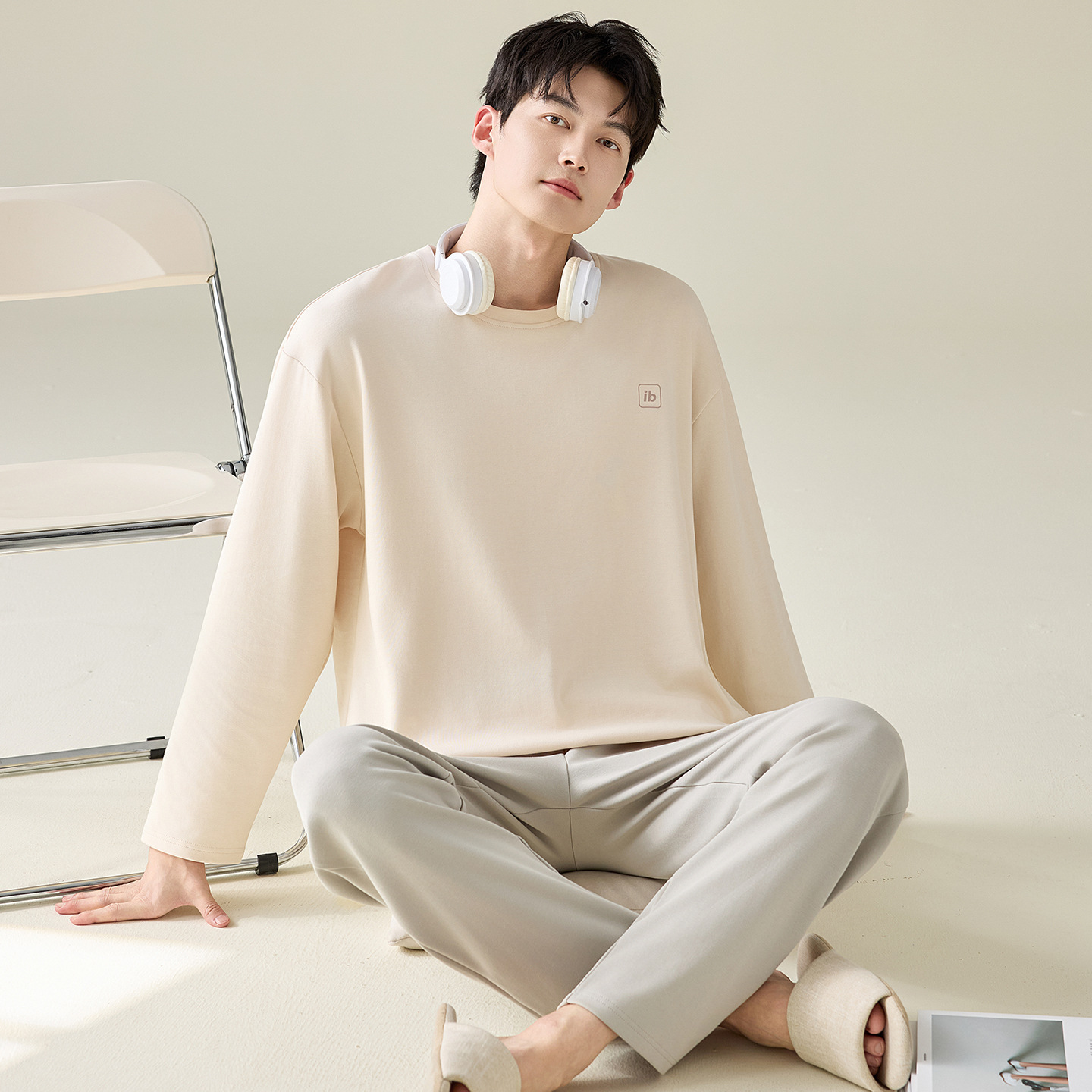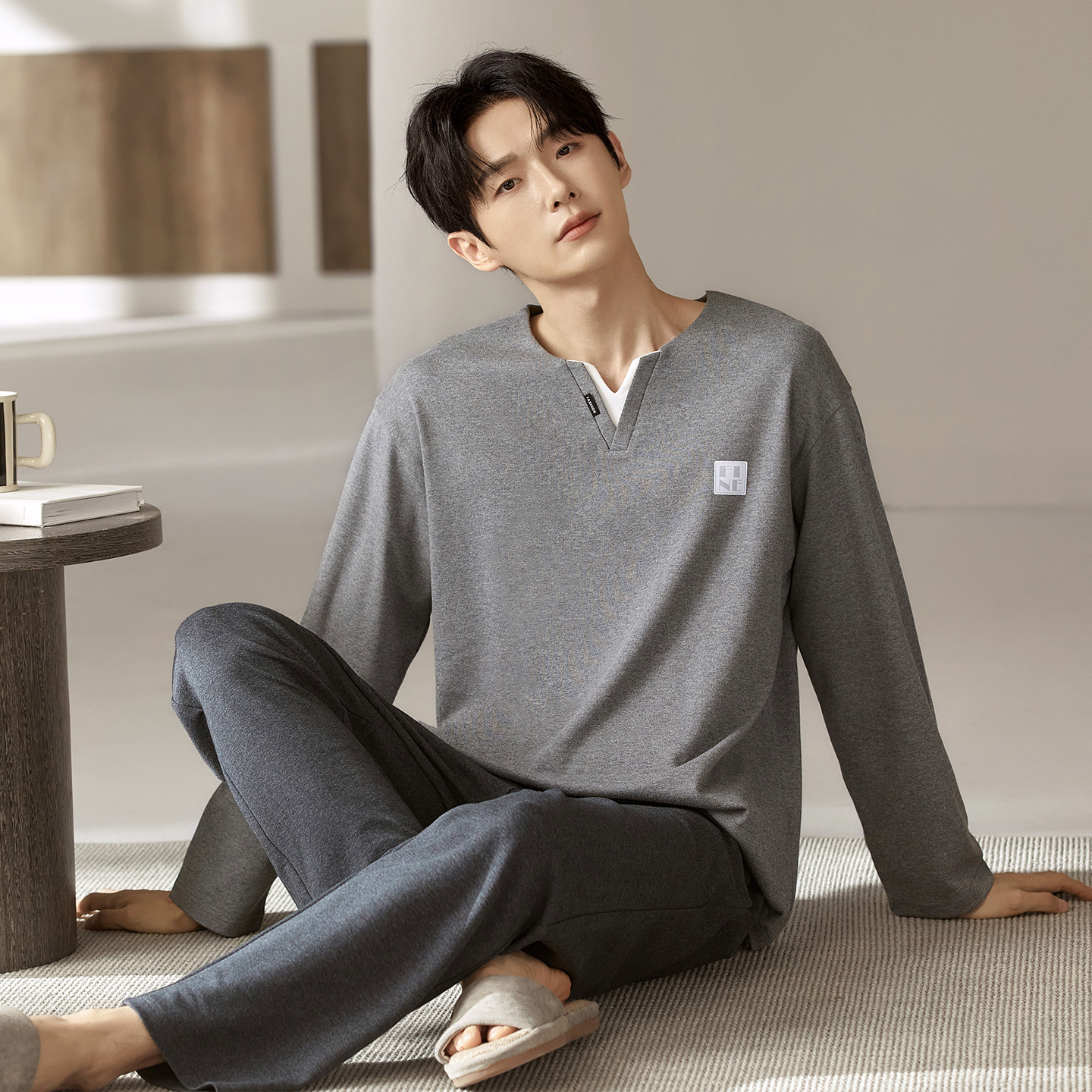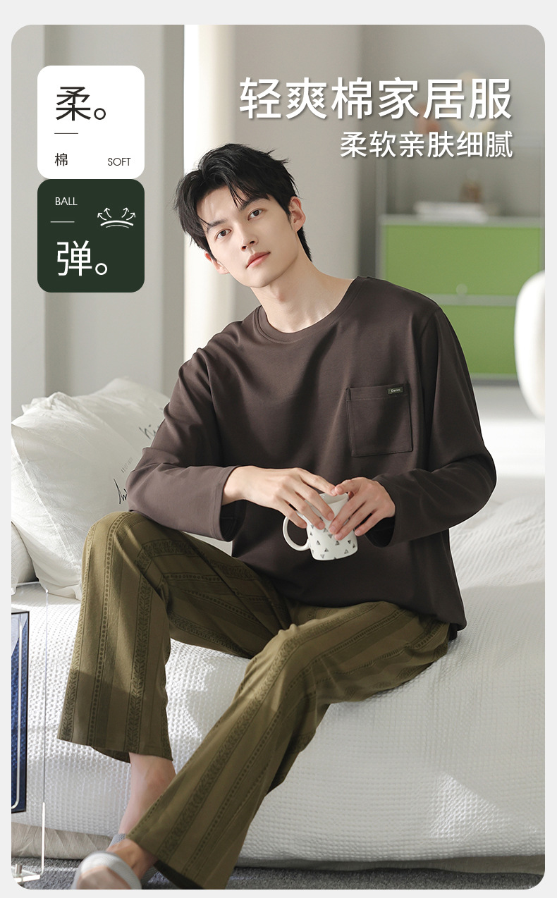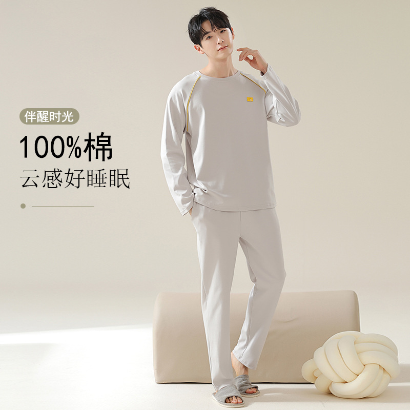 紧密纯棉睡衣男春秋季长袖长裤简约休闲风纯色男士大码家居服套装