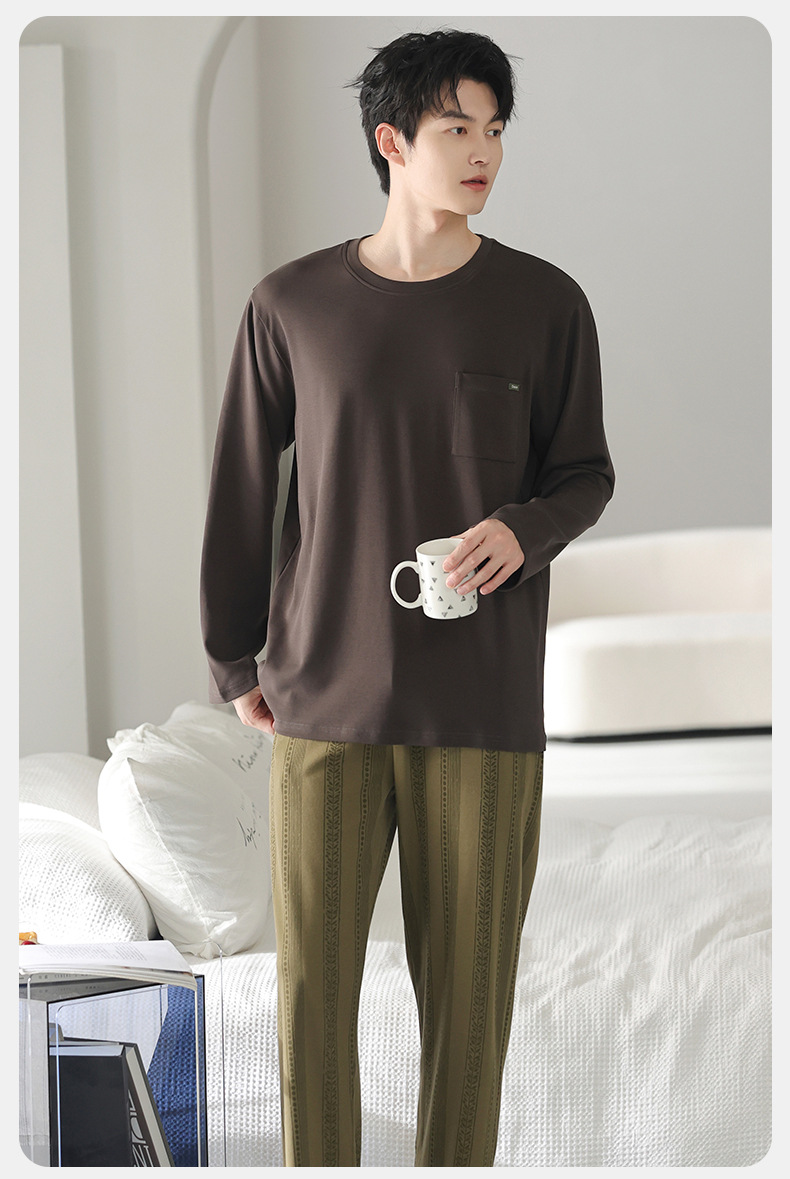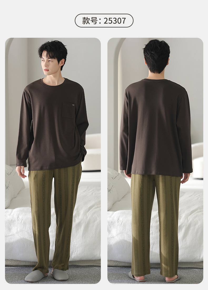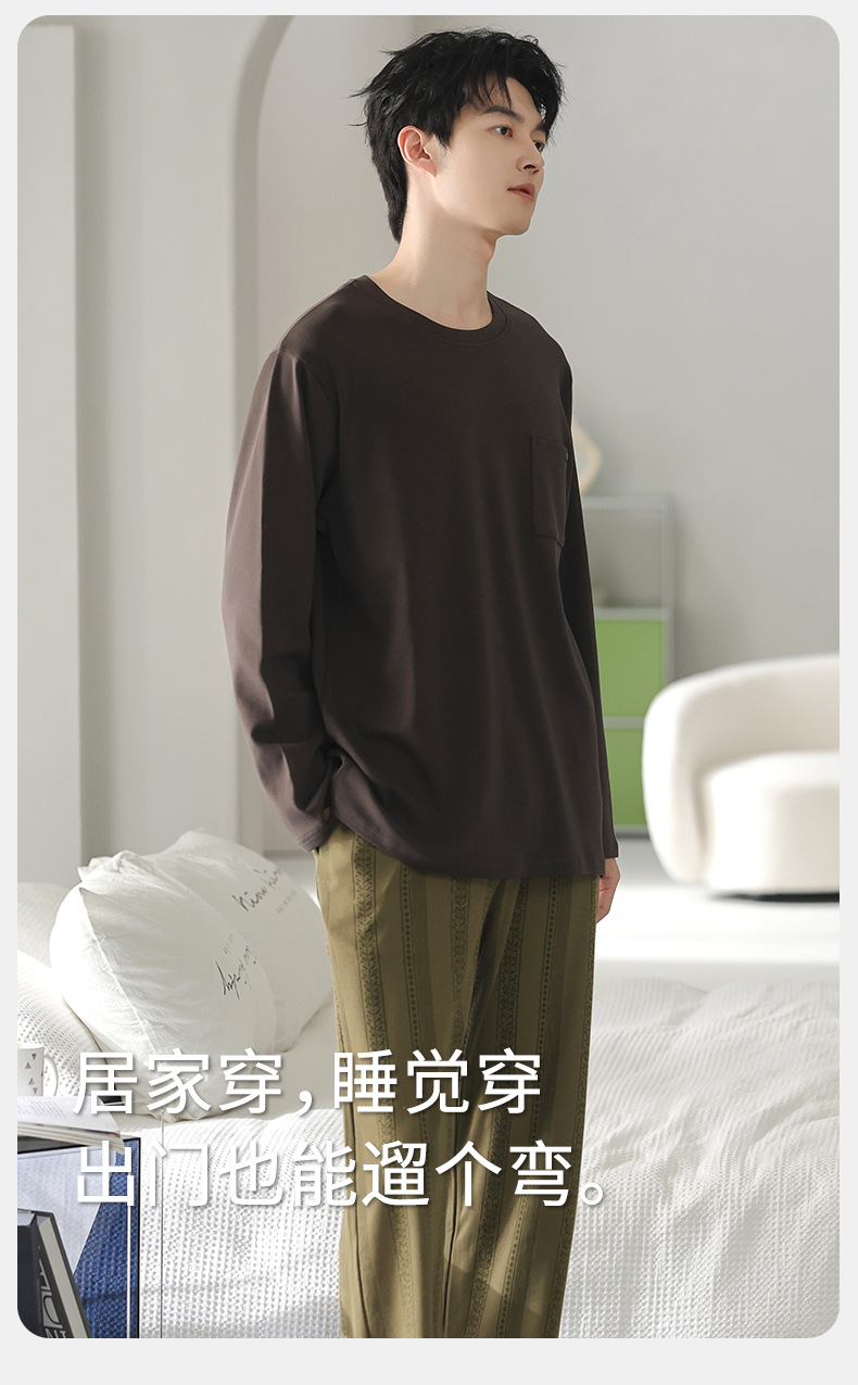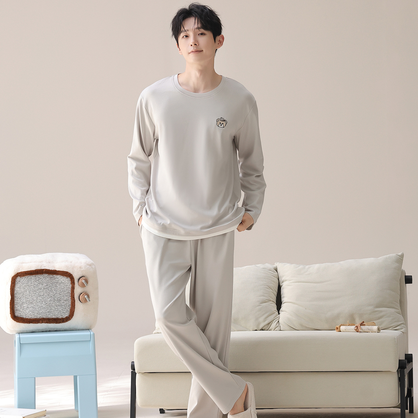 紧密纯棉睡衣男春秋季长袖长裤简约休闲风纯色男士大码家居服套装