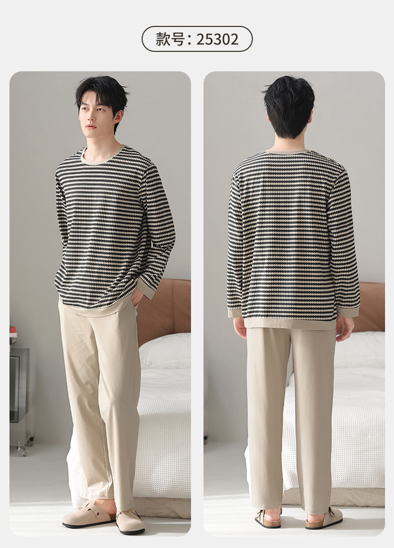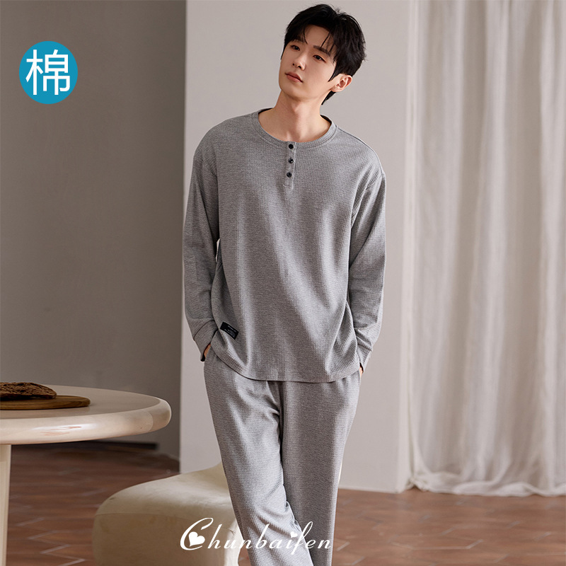 男士睡衣春秋季华夫格休闲纯棉长袖四季大码可外穿家居服秋冬套装