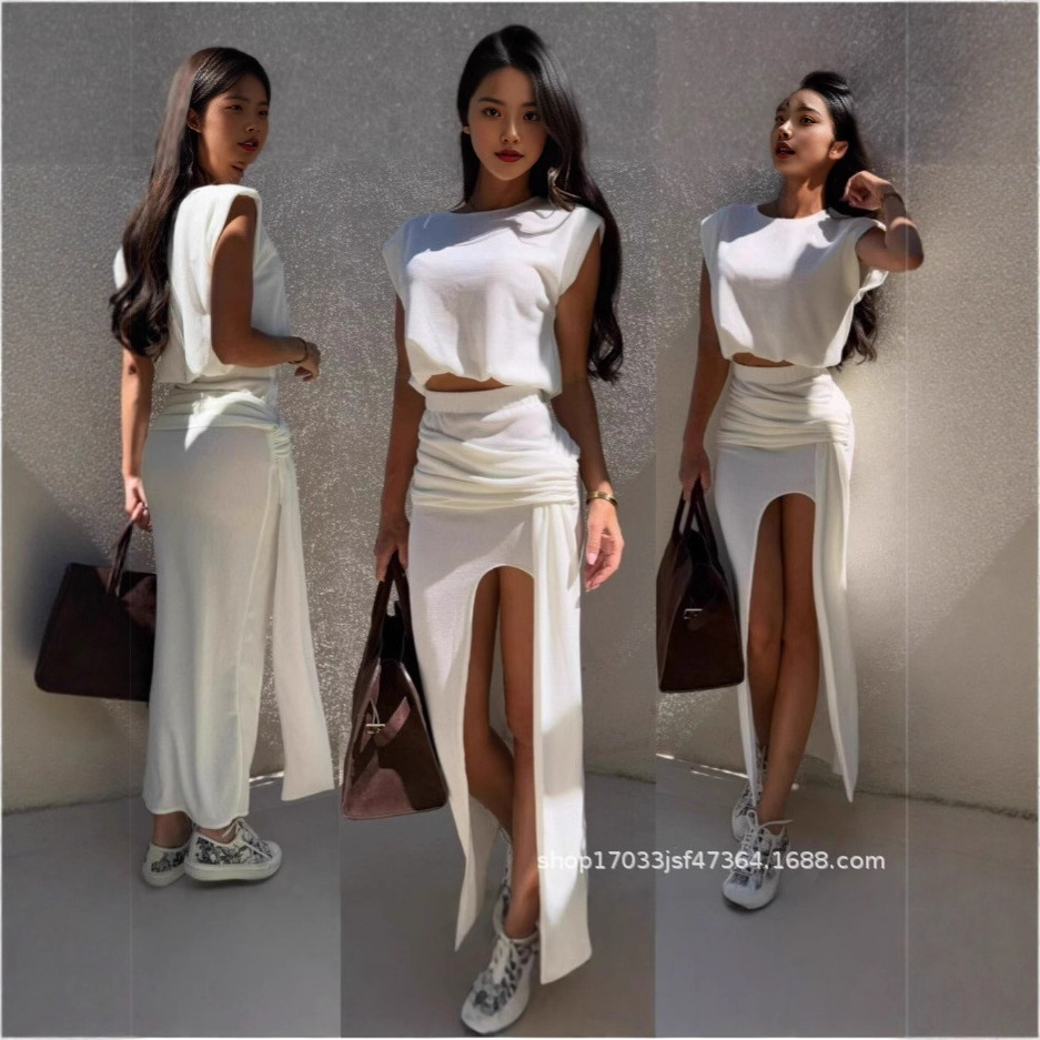 25 新しい中東クロスボーダー独立ステーションパーソナライズされたファッションラウンドネックノースリーブカジュアルトップミッドレングススカートスリット 2 点セット