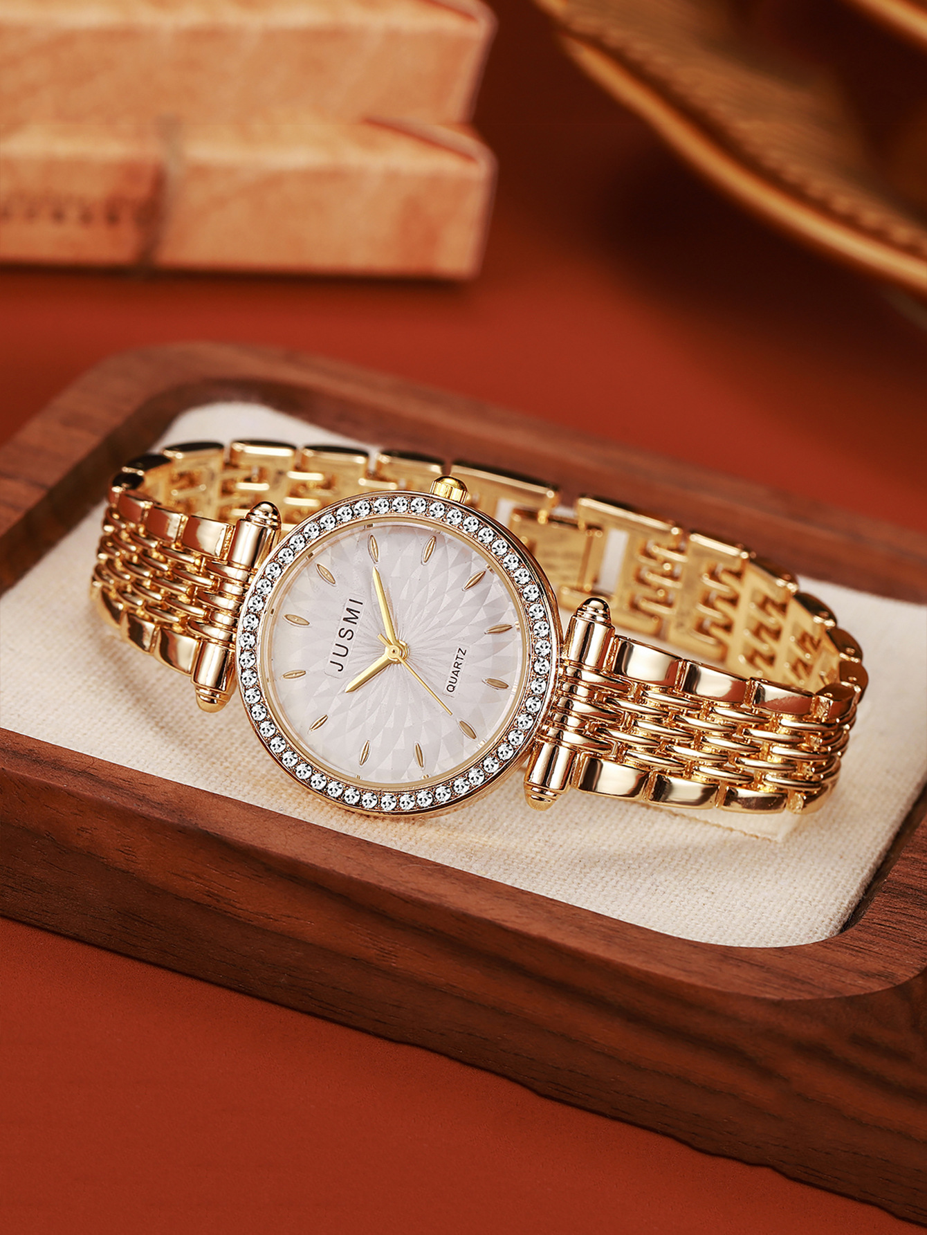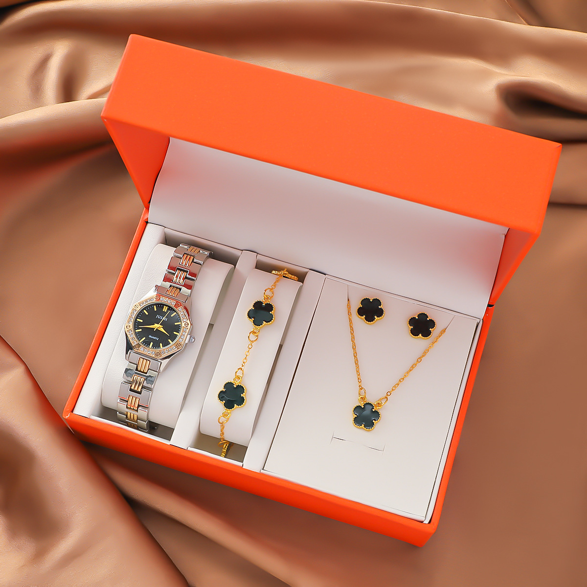 新款高级感钢带手表女士圆盘表轻奢石英表华朵手链项链精美套装