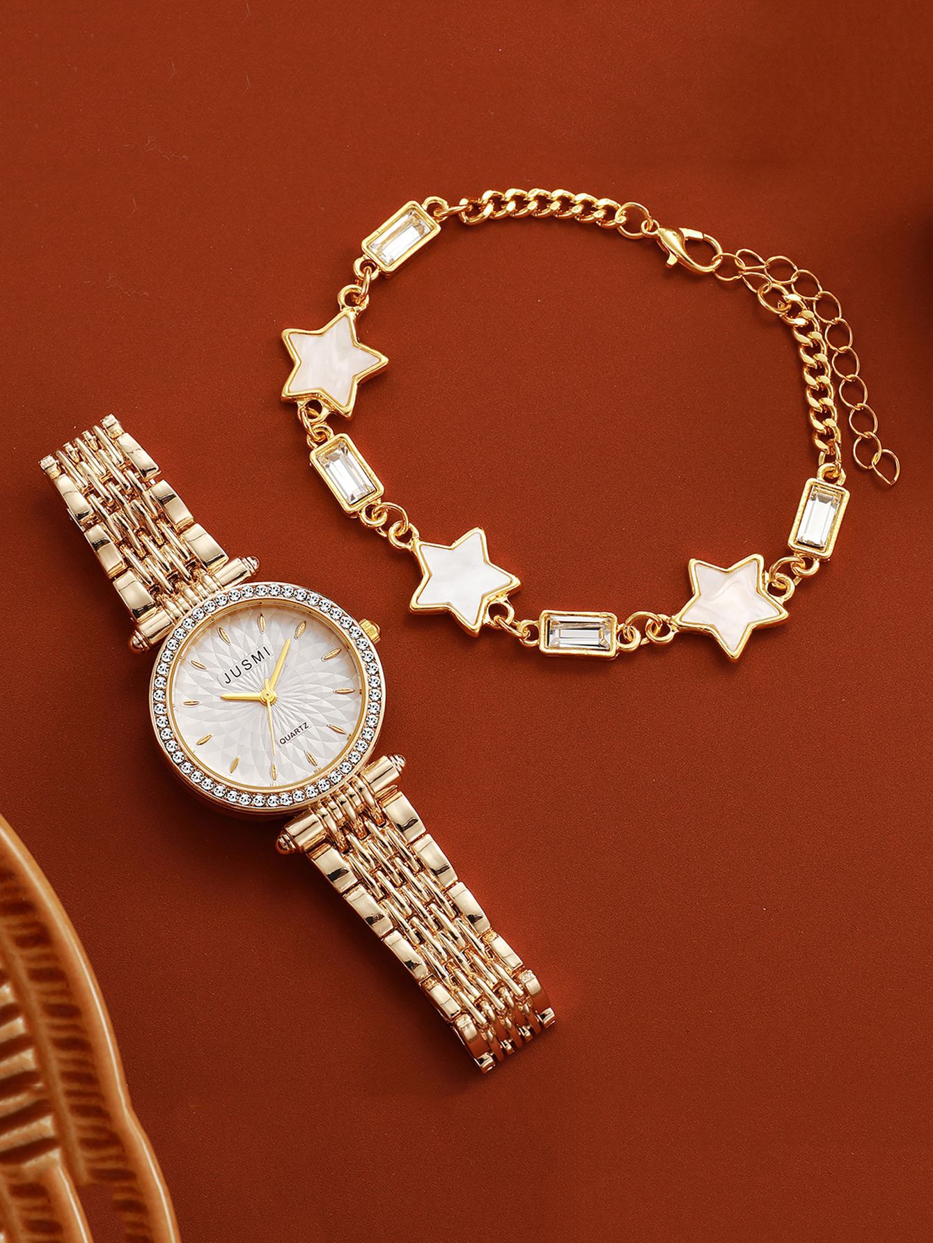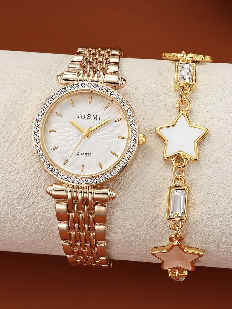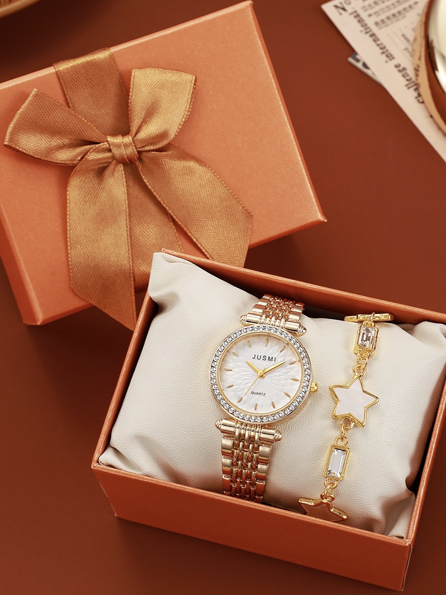 款女表小众高级感水钻表盘圆形手表女钢带腕表星星手链精美套装