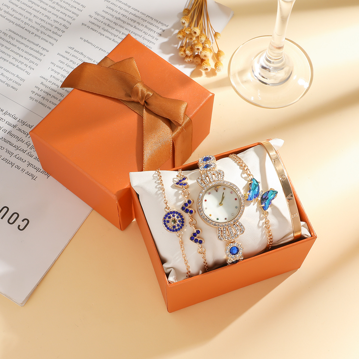 5pcs/set鋼帯女性時計偽三眼女性カジュアル韓国版石英腕時計セット (オレンジ色の箱)