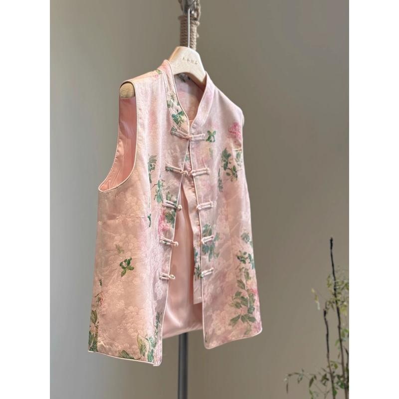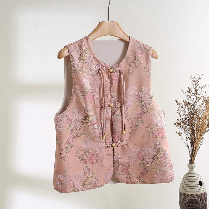 ピンク色の新中式ベスト、サテン生地に高級感のあるプリント、スタンドカラー、改良された唐装風、若者向け、民族風、秋用薄手ベスト