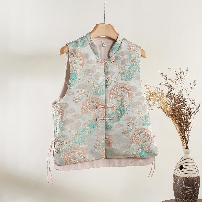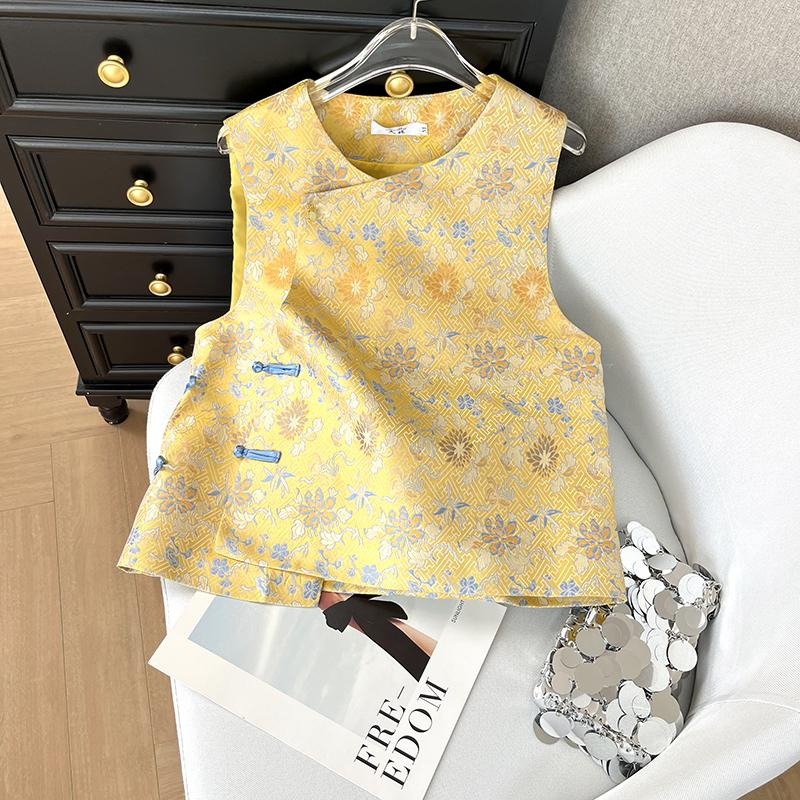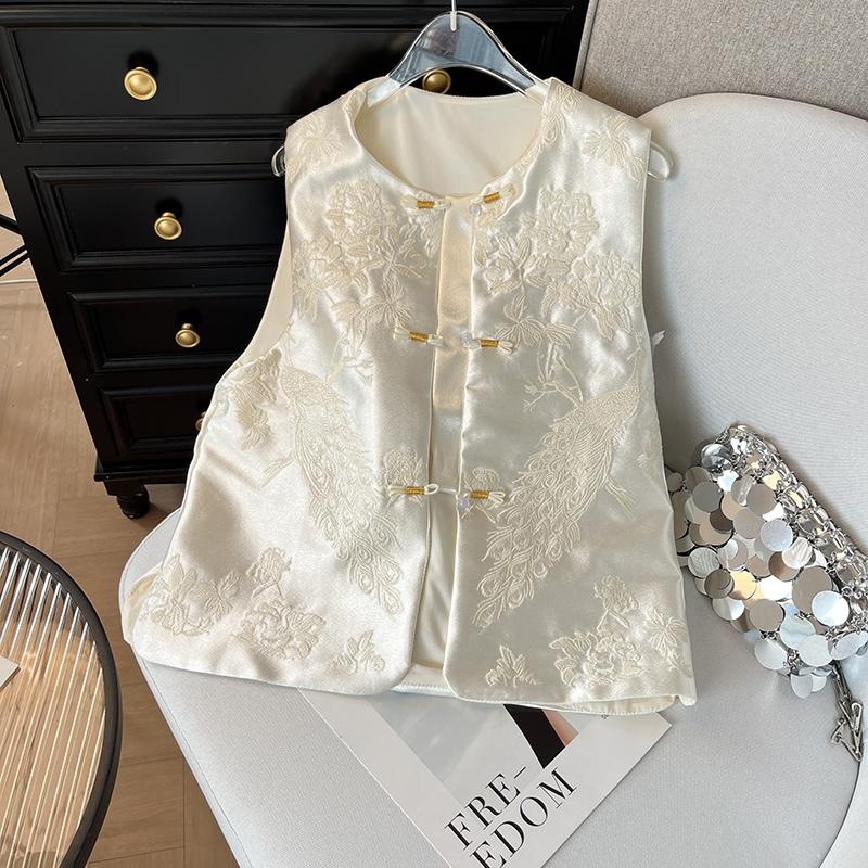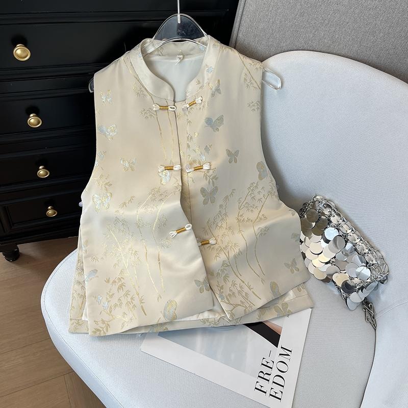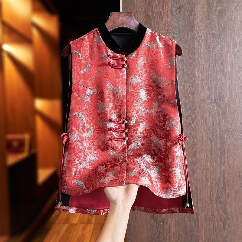 新中国式ベストサテン織錦ノースリーブバックル女性気質減齢高級感ベストコート小柄外付け