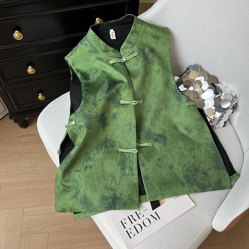 新しい中国風の国民風、年齢を減らす絶妙なグリーンジャカードベスト、マザーズウェア、スタンドカラー、ボタン付きノースリーブトップジャケット