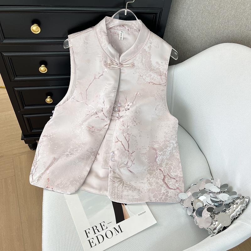 2025 春の新中国風スタンドカラーピンク年齢軽減ベスト女性のための新しいレトロジャカードライト高級改良されたベスト