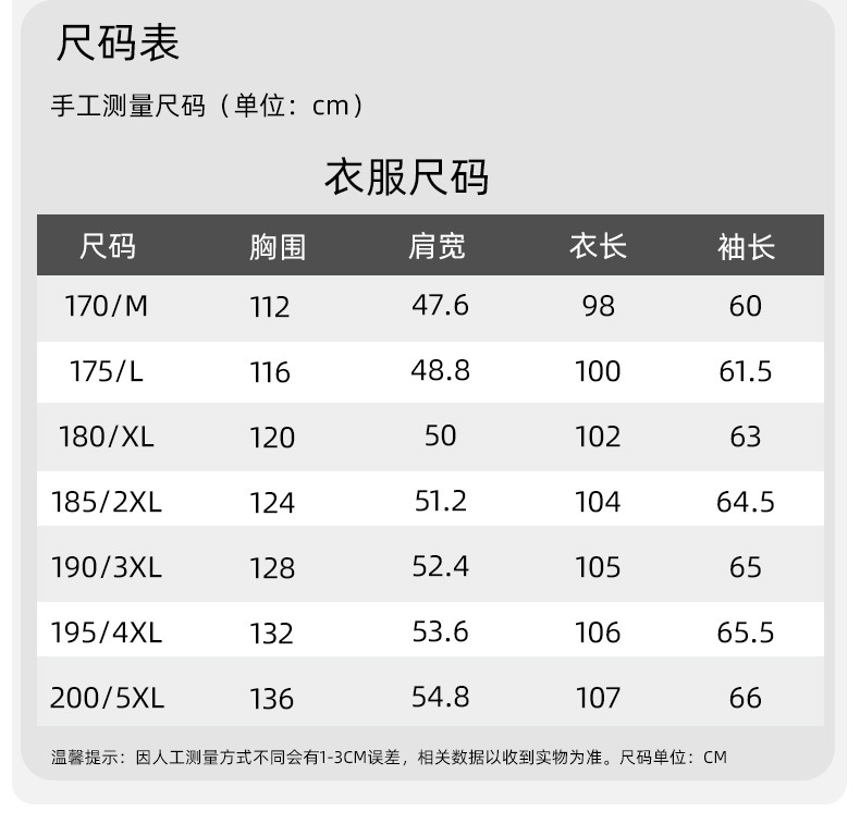 尺码 M170,L175,XL180,2XL185,3XL190,4XL195,5XL200
