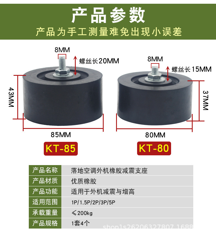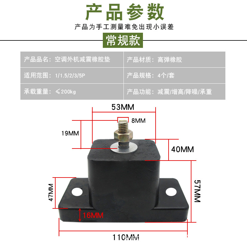 颜色 1套【4只】,5套【20只】,10套【40只】,20套【80只】,30套【120只】,50套【200只】,100套【400只】,减震脚【1套4只装】,KT-U减震垫(1套/4只装)通用1-3p空调,KT-U2减震垫(1套/4只装)通用1-5p空调,KT-U3减震垫(1套/4只装)通用1-1.5p空调,KT-E1减震垫(1套/4只装)通用1-1.5p空调,KT-E2减震垫(1套/4只装)通用1-5p空调,KT-E3减震垫(1套/4只装)通用1-3p空调,KT-C减震脚垫(1套/4只装)通用1-2p空调,KT-80减震脚垫(1套/4只装)通用1-5p空调,KT-85加大款减震脚垫(1套/4只装)通用1-5p空调,KT-D减震脚垫(1套/4只装)通用2-8p空调,KT-G加强款减震脚垫(4只装)通用3P以上空调,多功能减震垫1片装【无孔】,多功能减震垫1片装【四孔】,KT-A减震垫(1套/4只装)通用1-3p空调,KTS-250减震大脚*2只(配螺丝),KT-120减震垫(1套4只),KTS-150减震垫(1套4只)