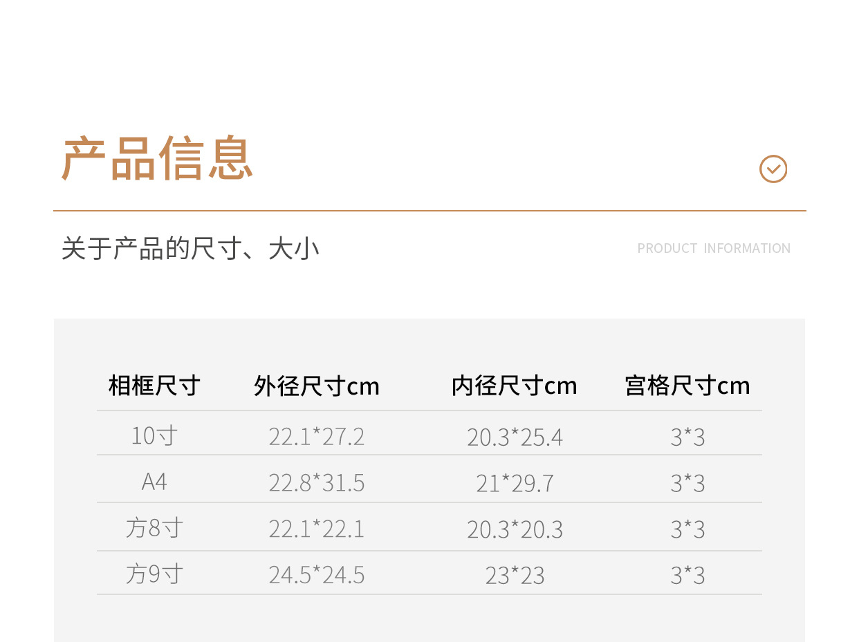 外框尺寸 10寸相框+20宫格卡纸+黑底卡纸+白乳胶,A4相框+24宫格卡纸+黑底卡纸+白乳胶,正方形8寸相框+16宫格卡纸+黑底卡纸+白乳胶,正方形9寸相框+宫格孔卡纸+黑底卡纸+白乳胶壳