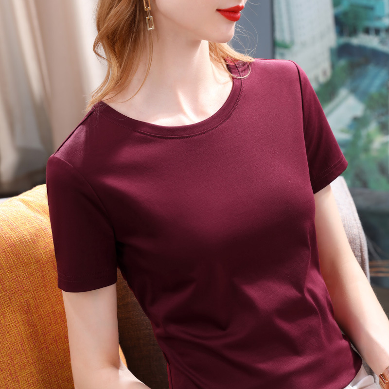 コットン半袖Tシャツレディース2025年夏新作ラウンドネックバーガンディスリムフィットシャツトップ