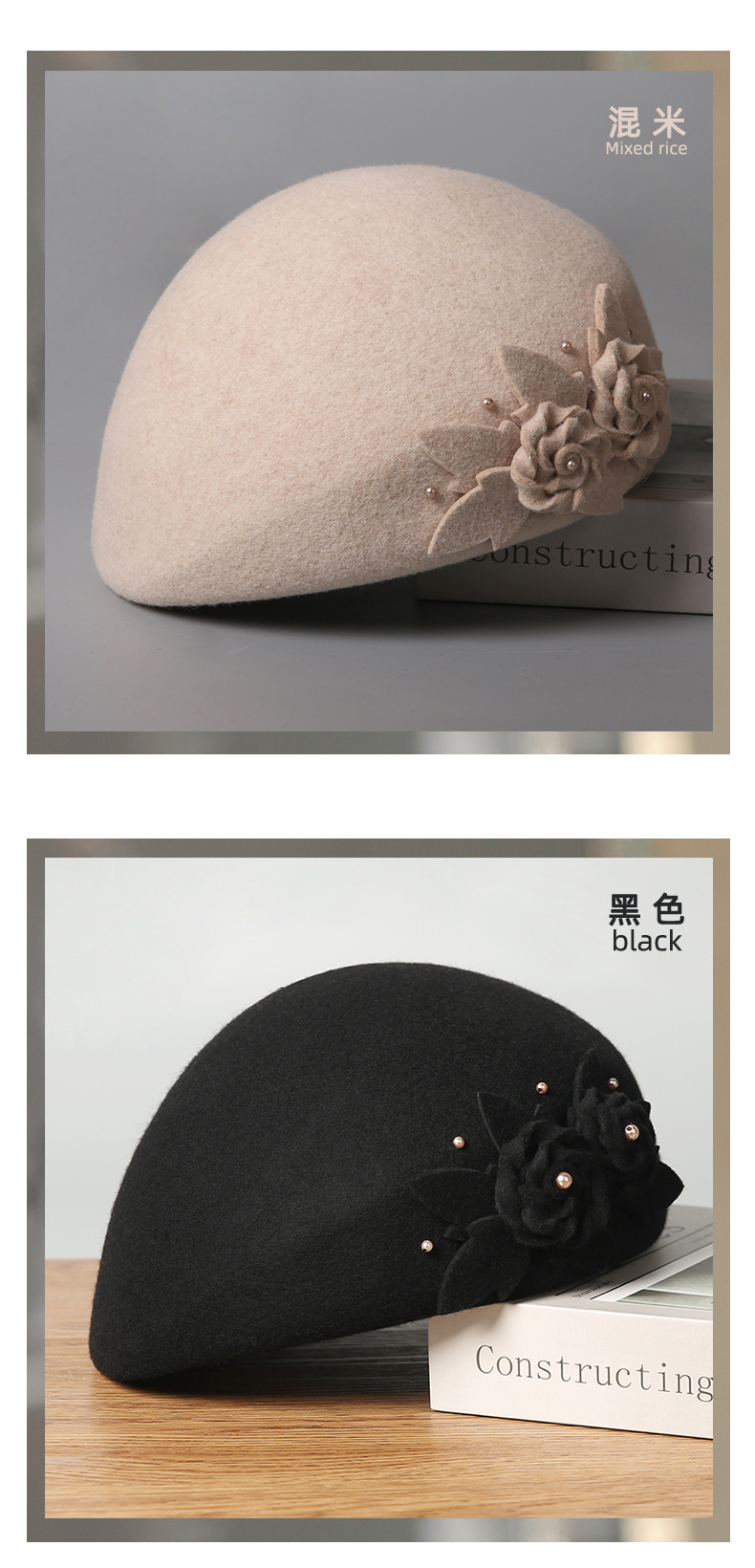 秋冬季帽子女小花朵装饰羊毛贝雷帽定型帽时尚毡帽时尚礼帽批发