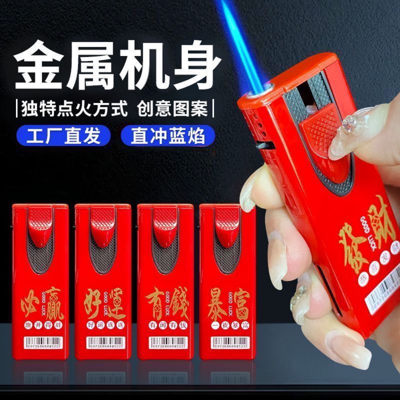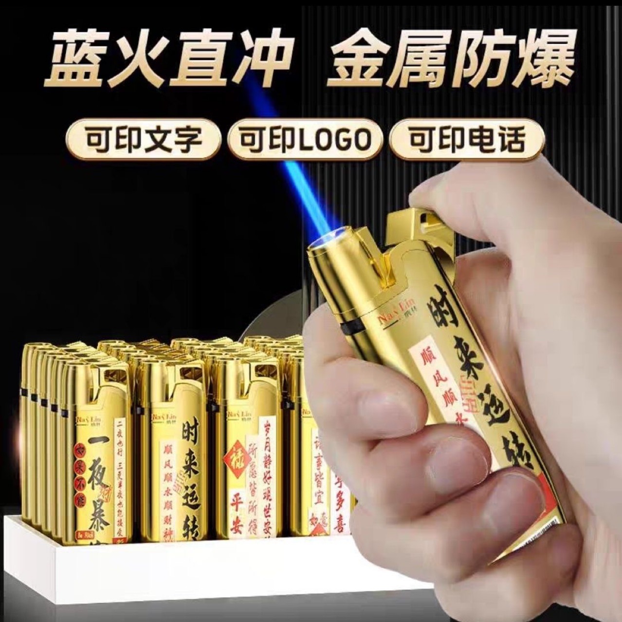 批发价50支创意打火机防风新款耐用金属充气商超广告蓝焰直冲