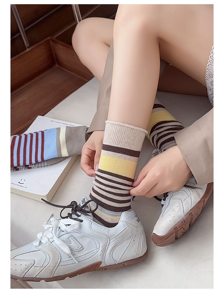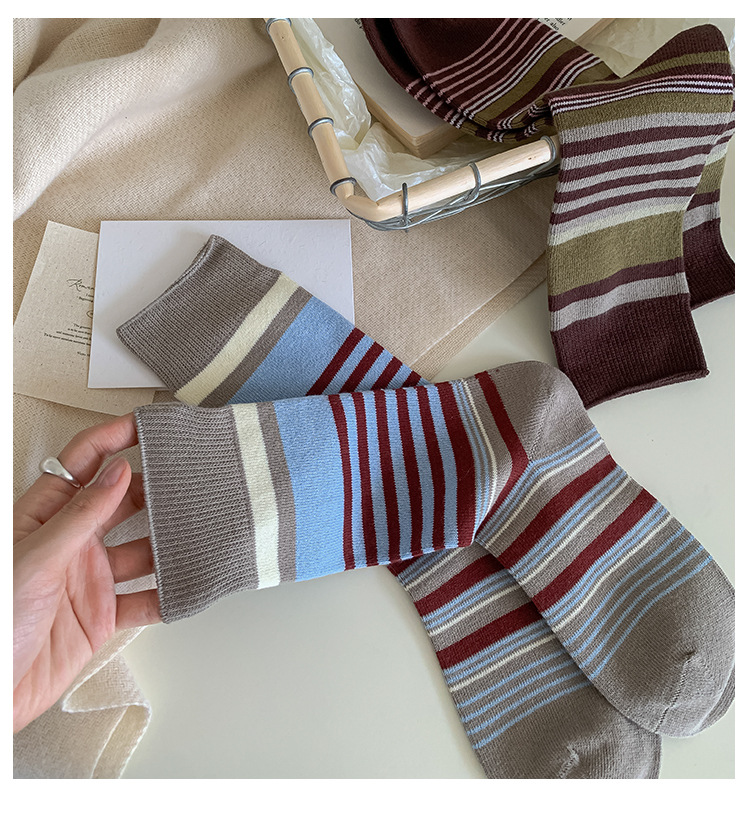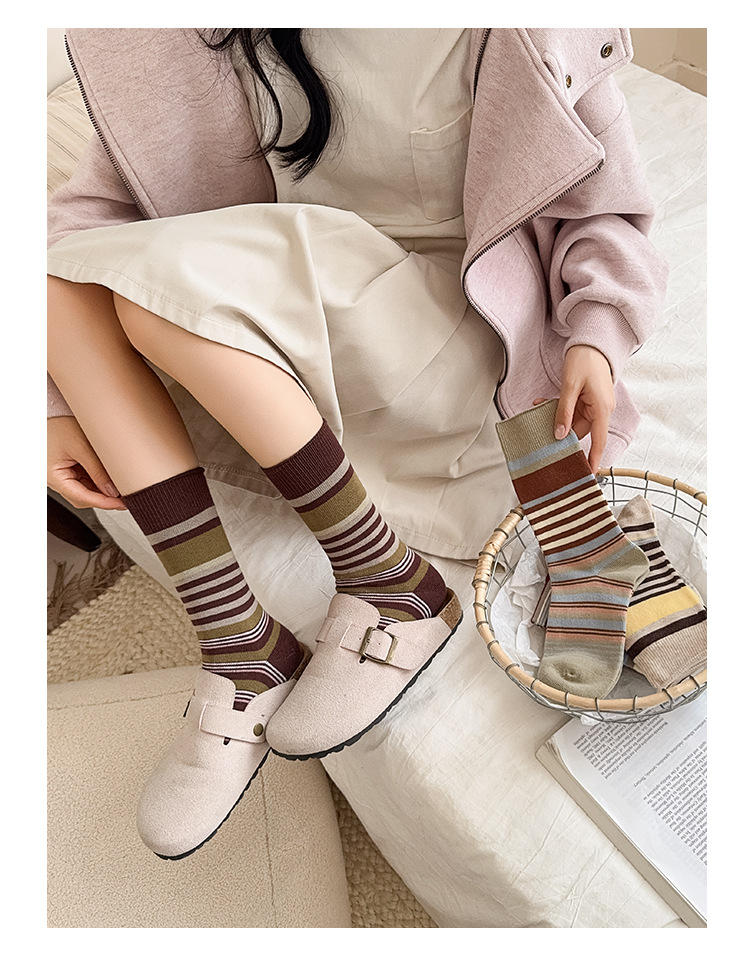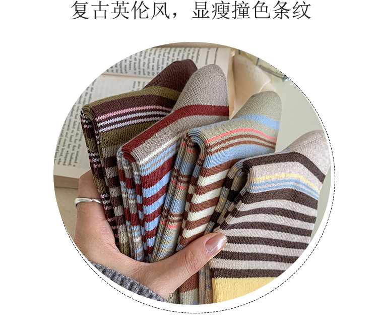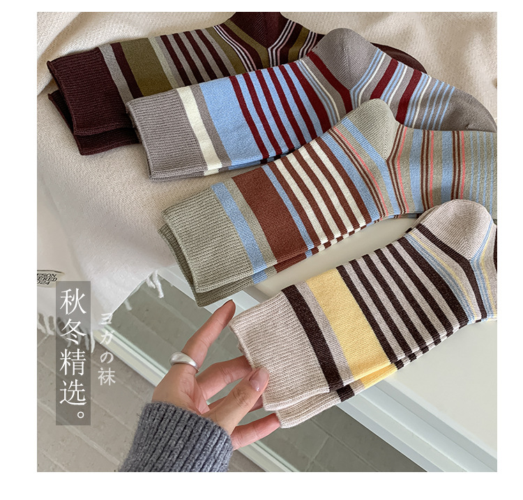 秋冬复古条纹袜子女中筒袜ins潮网红款外穿长筒堆堆袜新款厚棉袜