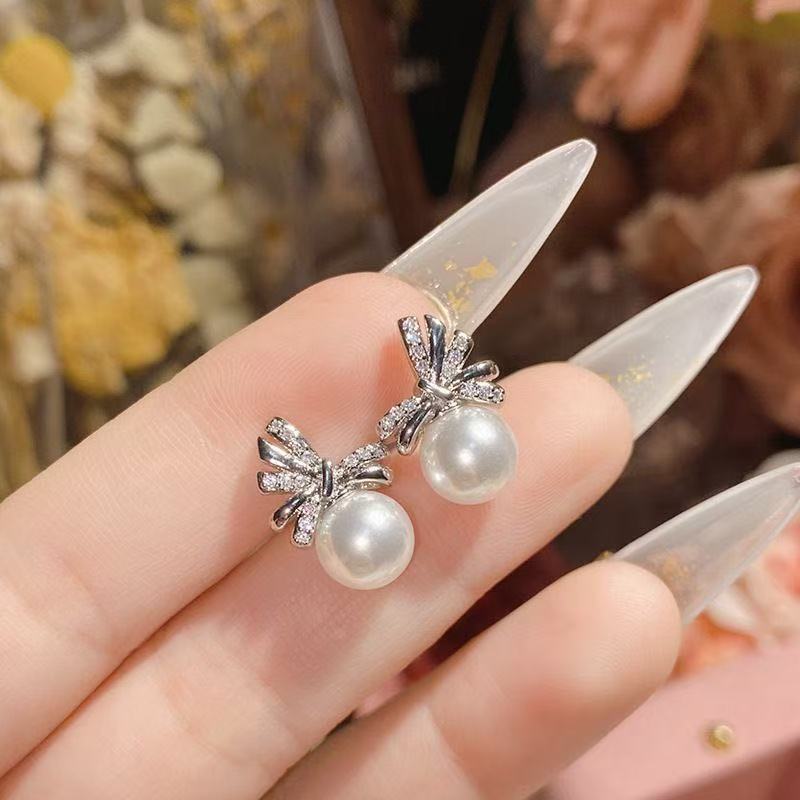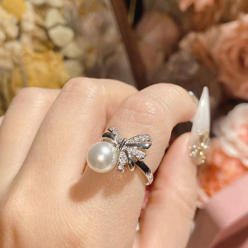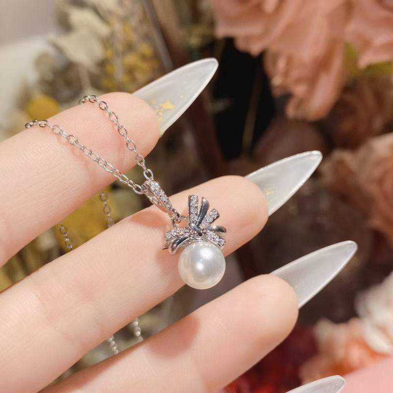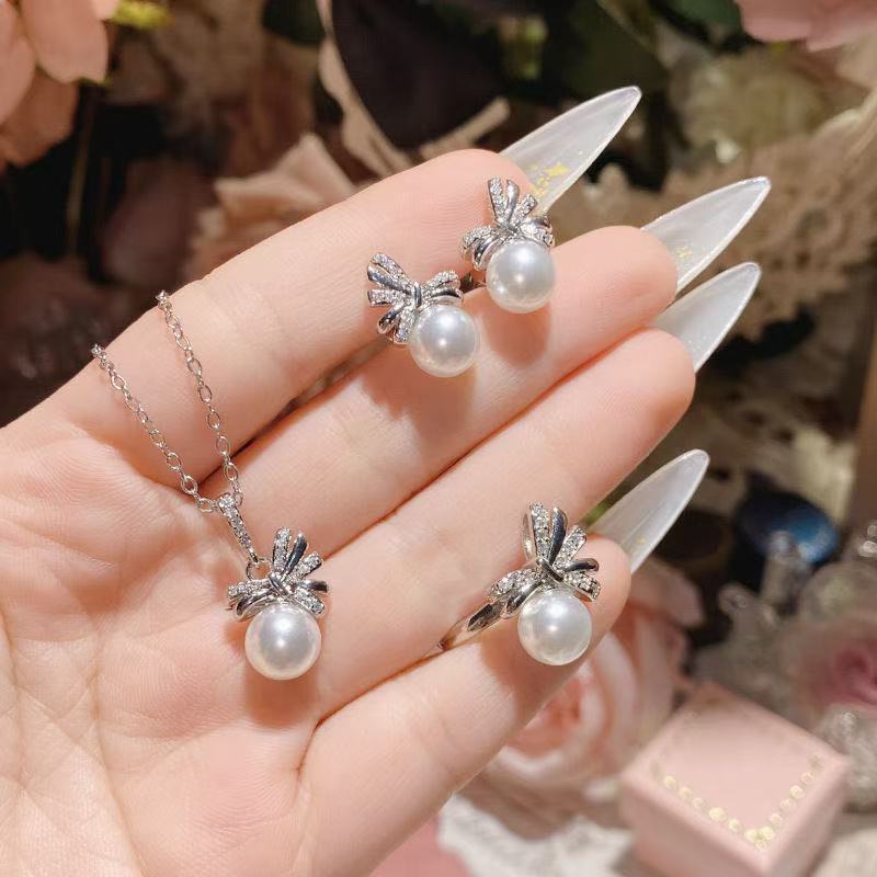 韩版甜美山茶简约高级感气质蝴蝶结珍珠项链耳钉戒指套装女礼物