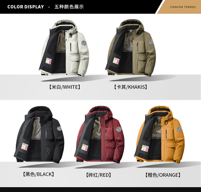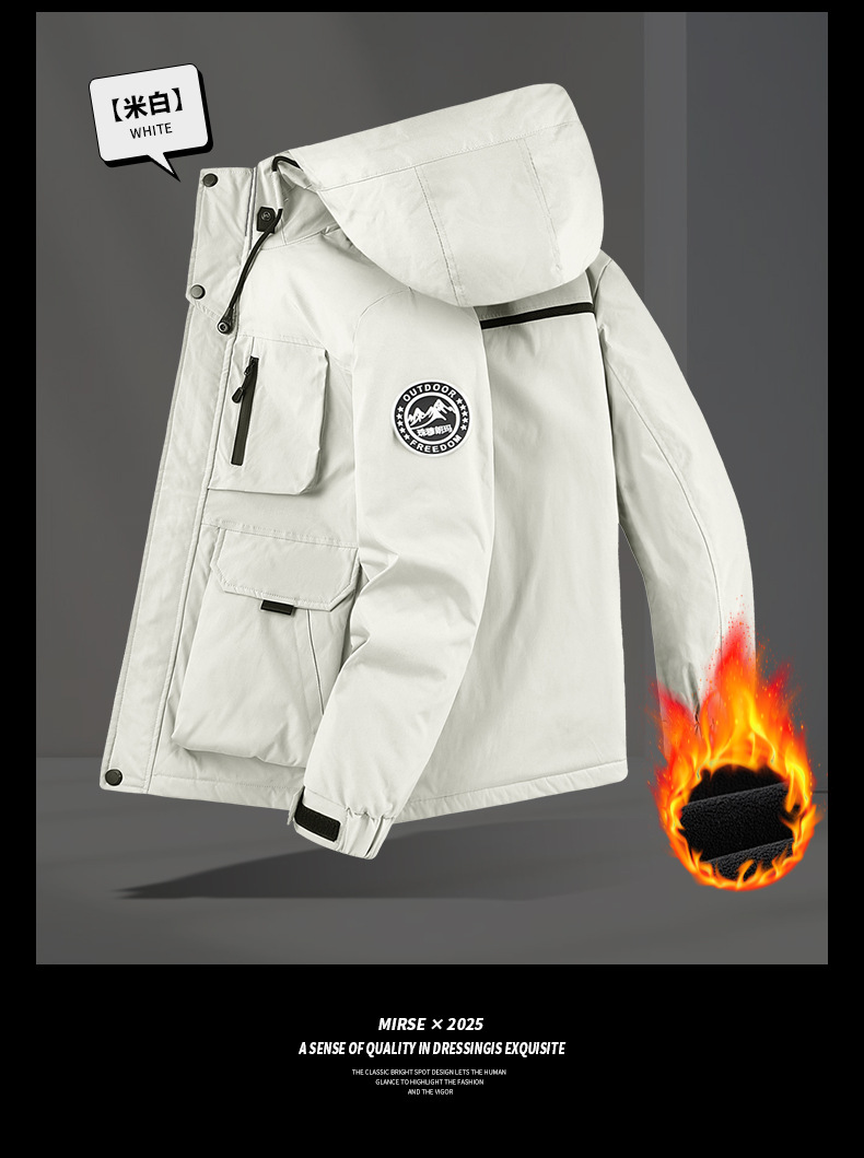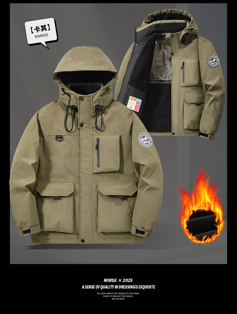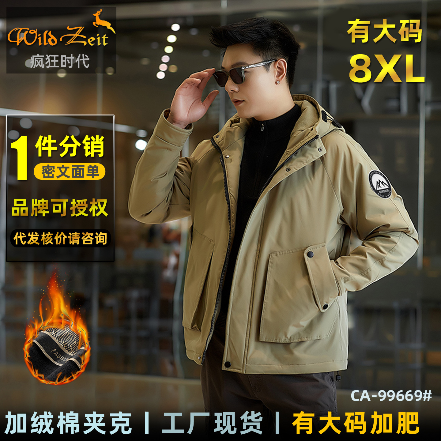 美式休闲加绒夹克男新款宽松大码工装外套加肥胖子冬户外连帽棉衣