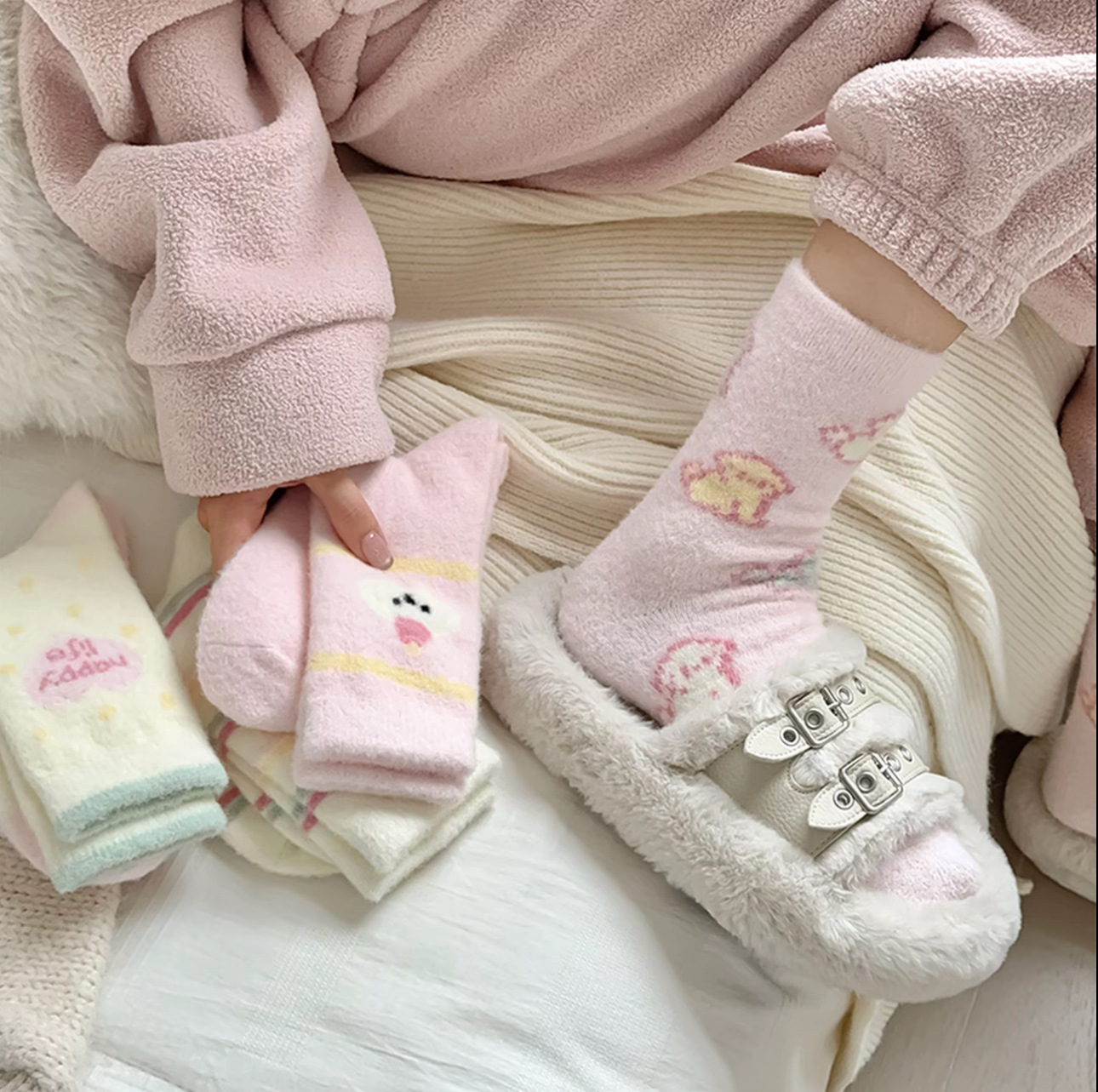 冬季粉色睡眠袜子女可爱卡通软糯毛茸茸保暖中筒袜加厚加绒地板袜