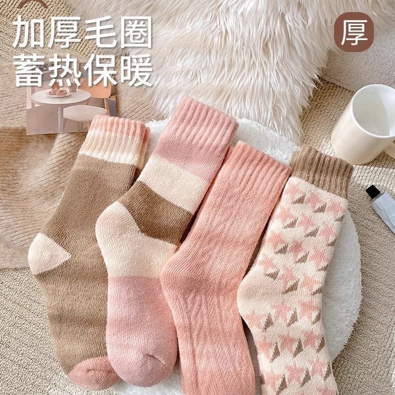甜美粉色系毛绒袜子女冬季加厚保暖澳绒中筒袜高腰家居睡眠月子袜