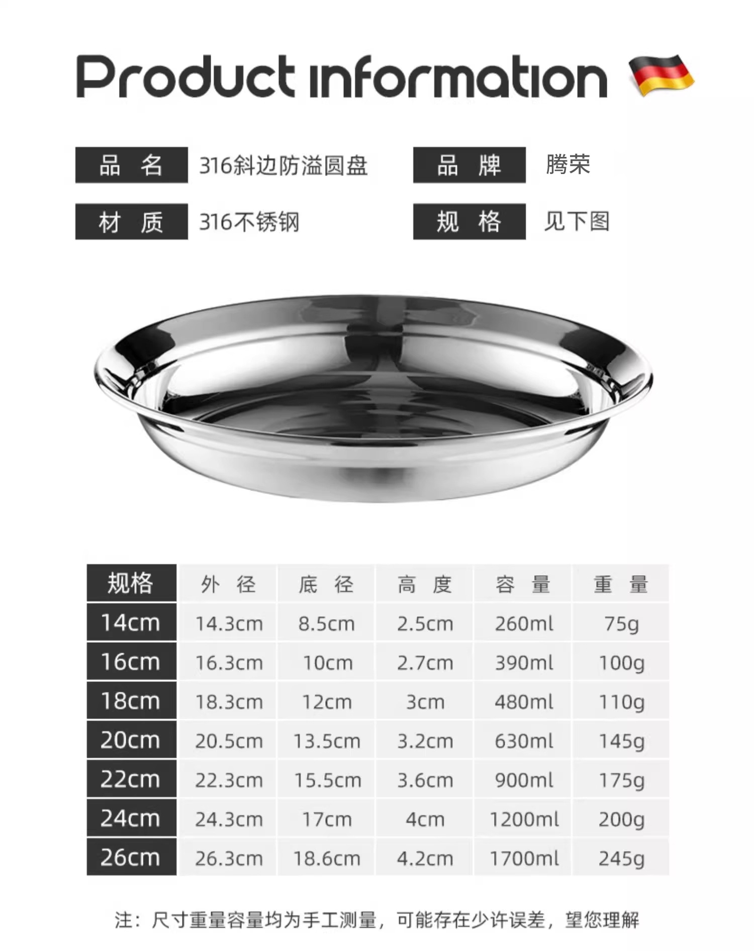 颜色 钢印-316防溢圆盘14cm,钢印-316防溢圆盘16cm,钢印-316防溢圆盘18cm,钢印-316防溢圆盘20cm,钢印-316防溢圆盘22cm,钢印-316防溢圆盘24cm,钢印-316防溢圆盘26cm