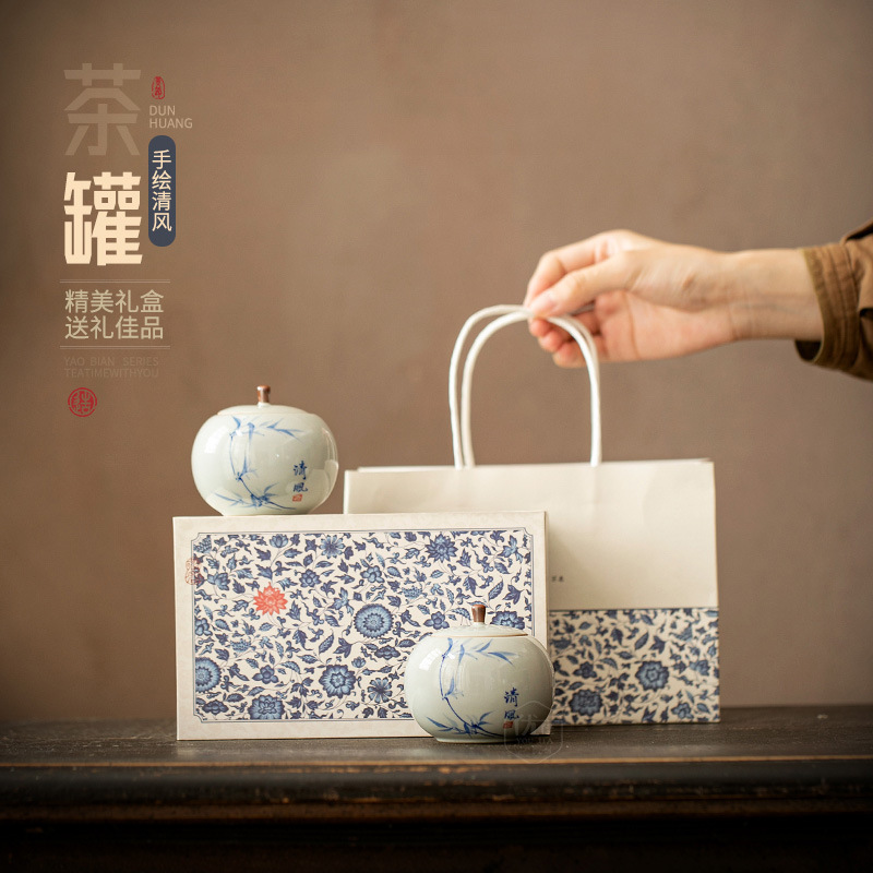 中国式陶磁器茶葉缶旅行携帯密封缶書道トランペット携帯アイデア茶葉包装ビジネスギフトボックス